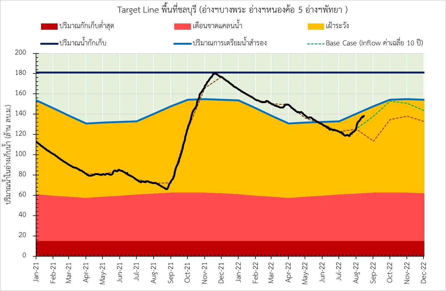 Target Line และการคาดการณ์สถานการณ์น้าในอ่างเก็บน้าพืนที่ชลบุรี วันที่ 15 ส.ค. 65 ปริมาณน้ารวม 2 อ่างชลบุรี และ 5 อ่างพัทยา 138.29 ล้าน ลบ.ม. 155 130 สภาวะปกติ All Clear) การเตรียมน้าส้ารอง • ผันน้าบางปะกง คลองพระองค์ (ตามสถานการณ์น้า) • เพิ่มการผันน้าจากพืนที่ระยอง (ตามสถานการณ์น้า)เตือนขาดแคลนนเฝ้าระวัง้า • ผันน้าอ่างฯคลองหลวง (ตามสถานการณ์น้า) • พิจารณหาแหล่งน้าเอกชนอื่นๆ เพิ่มเติม • ปรับลดการใช้น้ากิจกรรมต่างๆ ปริมาณน้ากักเก็บต่้าสุด 15.05 MCM. 155 130 155 การเตรียมน้าส้ารอง