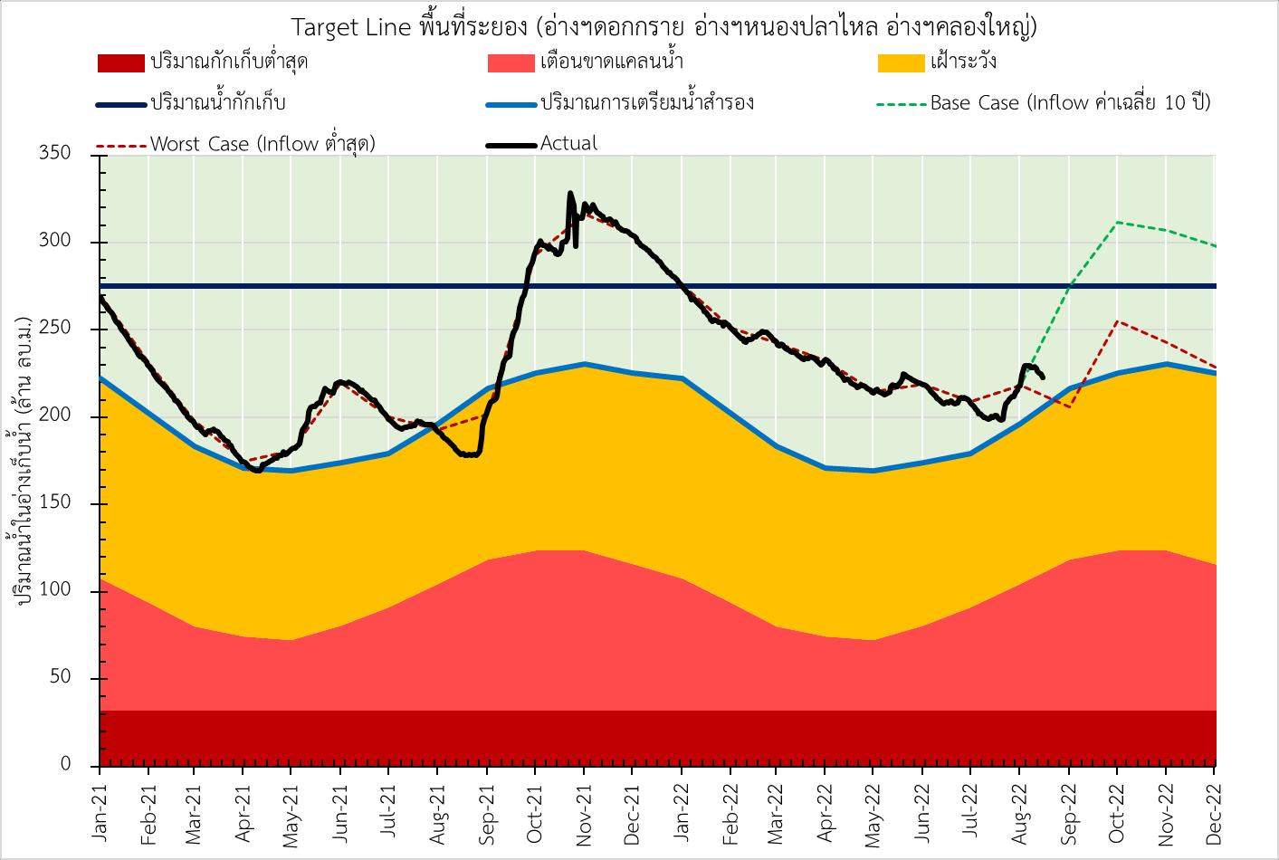 สถานการณ์น้าในอ่างเก็บน้าจังหวัดระยอง รวม 3 อ่าง : อ่างเก็บน้าดอกกราย อ่างเก็บน้าหนองปลาไหล อ่างเก็บน้าคลองใหญ่ ม.ค. ก.พ. ม.ค. เม.ย. พ.ค. ม.ย. ก.ค. ส.ค. ก.ย. ต.ค. พ.ย. ธ.ค. 0 20 40 60 80 100 120 140 160 180 200 220 240 260 280 300 320 340 360 380 สูงสุด - 2547 2548 2557 2558 2559 2560 2561 2562 2563 2564 เก็บกัก ต่าสุด ปริมาณน้าก้นอ่าง เพิ่มความจุเก็บกัก URC - RID LRC - RID เ ลี่ย - 2565 สถานการณ์น้าของ อ่างเก็บน้าดอกกราย หนองปลาไหล และคลองใหญ่ และคลองใหญ่หนองปลาไหล้าดอกกราย้าในอ่างเก็บนปริมาณน(ล้านลบ.ม.) 0 50 100 150 200 250 300 350 31 31 30 30 29 29 28 27 27 26 26 15 ส.ค. 2565 222.871 ล้าน ลบ.ม. 80.97 % ปริมาณน้าเก็บกัก รวม อ่าง . ล้าน ลบ.ม. ปริมาณน้าต่าสุด ล้าน ลบ.ม. URC - RID LRC - RID เ ลี่ย -สูงสุด0 ปริมาณน้าก้นอ่าง . ล้าน ลบ.ม. 7 เพมความจชวคราว ปรมาณนาเกบกก . ล้าน ลบ.ม.