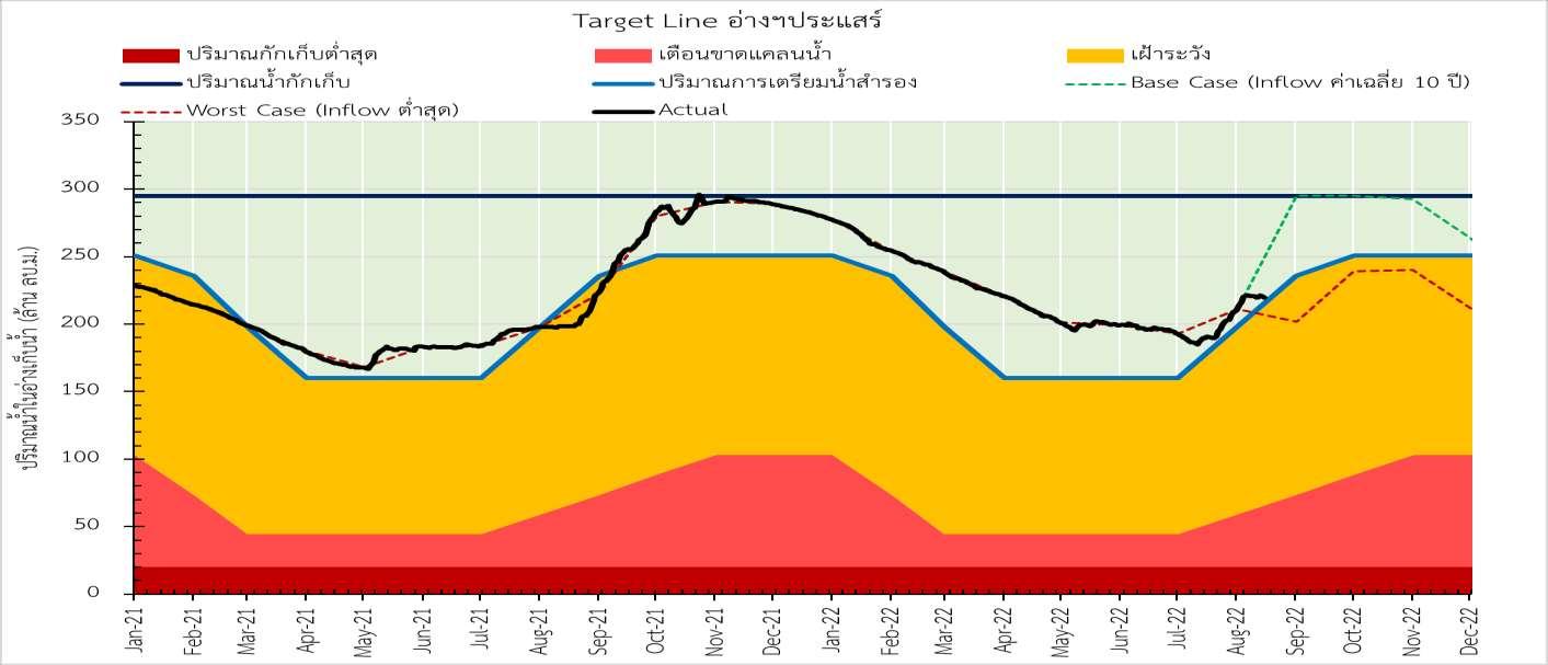 Target Line และการคาดการณ์สถานการณ์น้าในอ่างเก็บน้าพืนที่ระยอง ปริมาณน้ารวม 3 อ่าง ณ วันที่ 15 ส.ค. 65 222.87 ล้าน ลบ.ม. คิดเป็น 80.97%ปริมาณน้ากักเก็บ 275.25 MCM. สภาวะปกติ All Clear) การเตรียมน้าส้ารอง เตือนขาดแคลนนเฝ้าระวัง้า ปริมาณน้ากักเก็บต่้าสุด 31.7 MCM. 220 170 • ผันน้า PS KY และ PS – NPL (ตามสถานการณ์น้า) • ผันน้าวัดละหารไร่ (ตามสถานการณ์น้า) • ผันน้า PS-KY และ PS – NPL (เต็มประสิทธิภาพ) • ผันน้าวัดละหารไร่ (เต็มประสิทธิภาพ) • ปรับลดการใช้น้ากิจกรรมต่างๆ 220 170