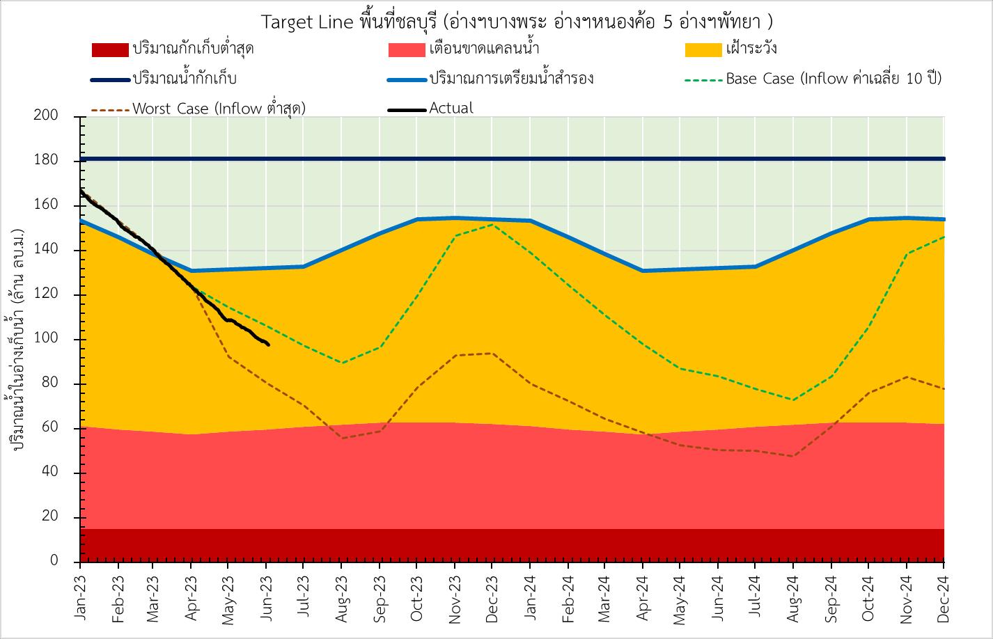 ้าในอ่างเก็บน้าพืนที่ชลบุรี วันที่ 2 มิ.ย. 66 ปริมาณน้ารวม 2 อ่างชลบุรี และ 5 อ่างพัทยา 97.78 ล้าน ลบ.ม. 155 130 สภาวะปกติ All Clear) การเตรียมน้าส้ารอง • ผันน้าบางปะกง / คลองพระองค์ (ตามสถานการณ์น้า) • เพิ่มการผันน้าจากพืนที่ระยอง (ตามสถานการณ์น้า) เฝ้าระวัง เตือนขาดแคลนน้า