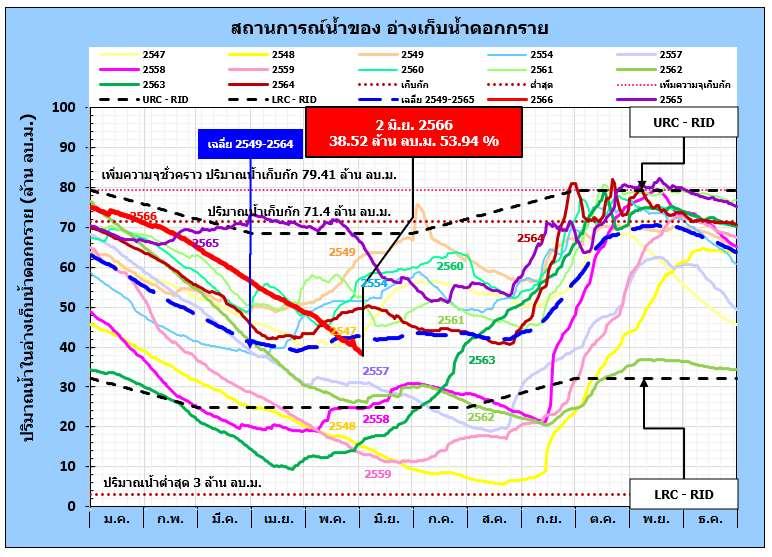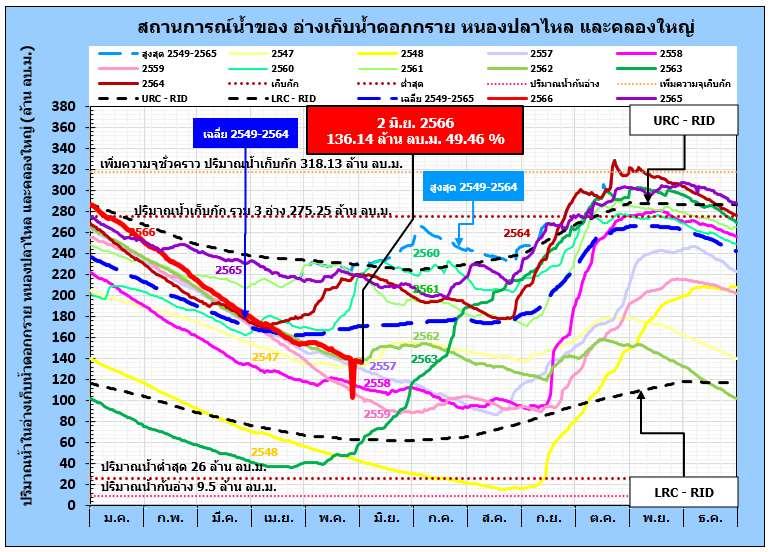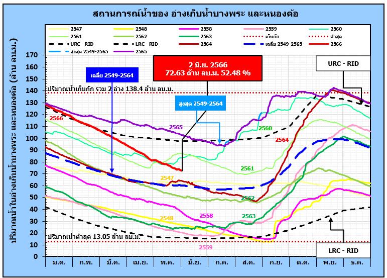 ปรมาณนาในอางเกบนาพนทชลบร-ระยอง วันที่2 มิ.ย. 66 1 ชลบุรี ระยอง บางพระ หนองค้อ ดอกกราย หนองปลา ไหล คลอง ใหญ่ ประแสร์ ปริมาณน้าเก็บกัก (ล้าน ลบ.ม.) (เพมความจชวคราว) 117.00 21.40 71.40 (79.41) 163.75 (187.62) 40.10 (51.10) 295.00 ปริมาณน้าวันที่2 มิ.ย. 66 (ล้าน ลบ.ม.) 58.11 14.52 38.52 84.96 12.66 196.02 ร้อยละความจุ 50% 68% 54% 52% 32% 66.4% ปรมาณนาใชการ (หัก Dead Storage) (ล้าน ลบ.ม.) 46.06 13.52 35.52 71.46 9.66 176.02 ปริมาณน้าท่าไหลลงอ่าง (ล้าน ลบ.ม.) วันที่1 มิ.ย. 66 - 0.2030.203 ปรมาณนาเมอเทยบกบสปดาห์ ก่อน (-ลดลง, +เพมขน) (ล้าน ลบ.ม.) -1.02 -0.78 -2.42 -1.67 -0.44 +1.35 -1.80 -4.53 รวมปรมาณนาแตละพนท 72.63 ล้าน ลบ.ม. (52.50%) 136.14 ล้าน ลบ.ม. (49.46%) Samnakbok Reserve Pond Khlong Yai res. Nong Pla Lai res. Dok Krai res. Private Pond Prasae res. Existing Pipe Network Constructing Pipe Network Raw Water Pipe Line (EW) Existing Pipe Network Constructing Pipe Network Raw Water Pipe Line (RID) Bang Phra res. Nong Kho res. P1 P4 P3 P8 P9 P12 P11 P13 P14 P5 P7 P P2 34.84 P6 P10 15.53 71.61 195.81 196.02 12.66 Demand 2566 (MCM.) Supply (MCM.) Pump Station XX XX XX หมายเหตุ ข้อมูลสถานการณ์น้ามาจากการรายงานของกรมชลประทาน ณ วันที่ 2 มิ.ย. 66 38.52 84.96 58.11 14.52 P15