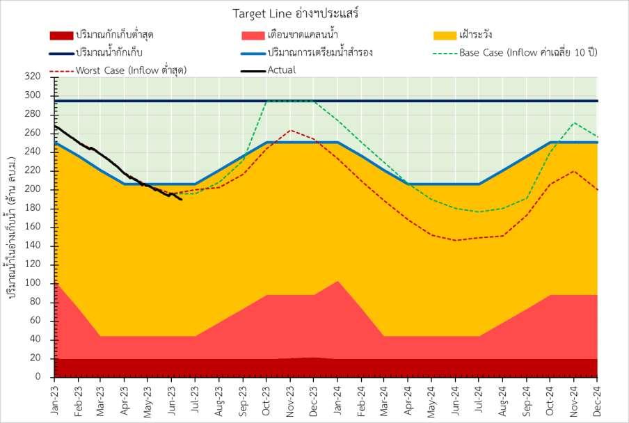 และการคาดการณ์สถานการณ์น้าใน อ่างเก็บน้าพืนที่ประแสร์ ปริมาณน้ากักเก็บ 295.00 MCM. 250 250 สภาวะปกติ All Clear) การเตรียมน้าส้ารอง เฝ้าระวัง เตือนขาดแคลนน้า ปริมาณน้ากักเก็บต่้าสุด 20.00 MCM. • ปรับลดการใช้น้ากิจกรรมต่างๆ • ผันน้าคลองสะพาน (ตามสถานการณ์น้า) • ผันน้าวังโตนด (ตามสถานการณ์น้า) • ลดการผันน้า PS – KY และ PS – NPL (ตามสถานการณ์น้า) ปริมาณน้าในอ่าง ณ วันที่ 23 มิ.ย. 66 188.70 ล้าน ลบ.ม. คิดเป็น 63.97% 250 160 การเตรียมน้าส้ารอง 160