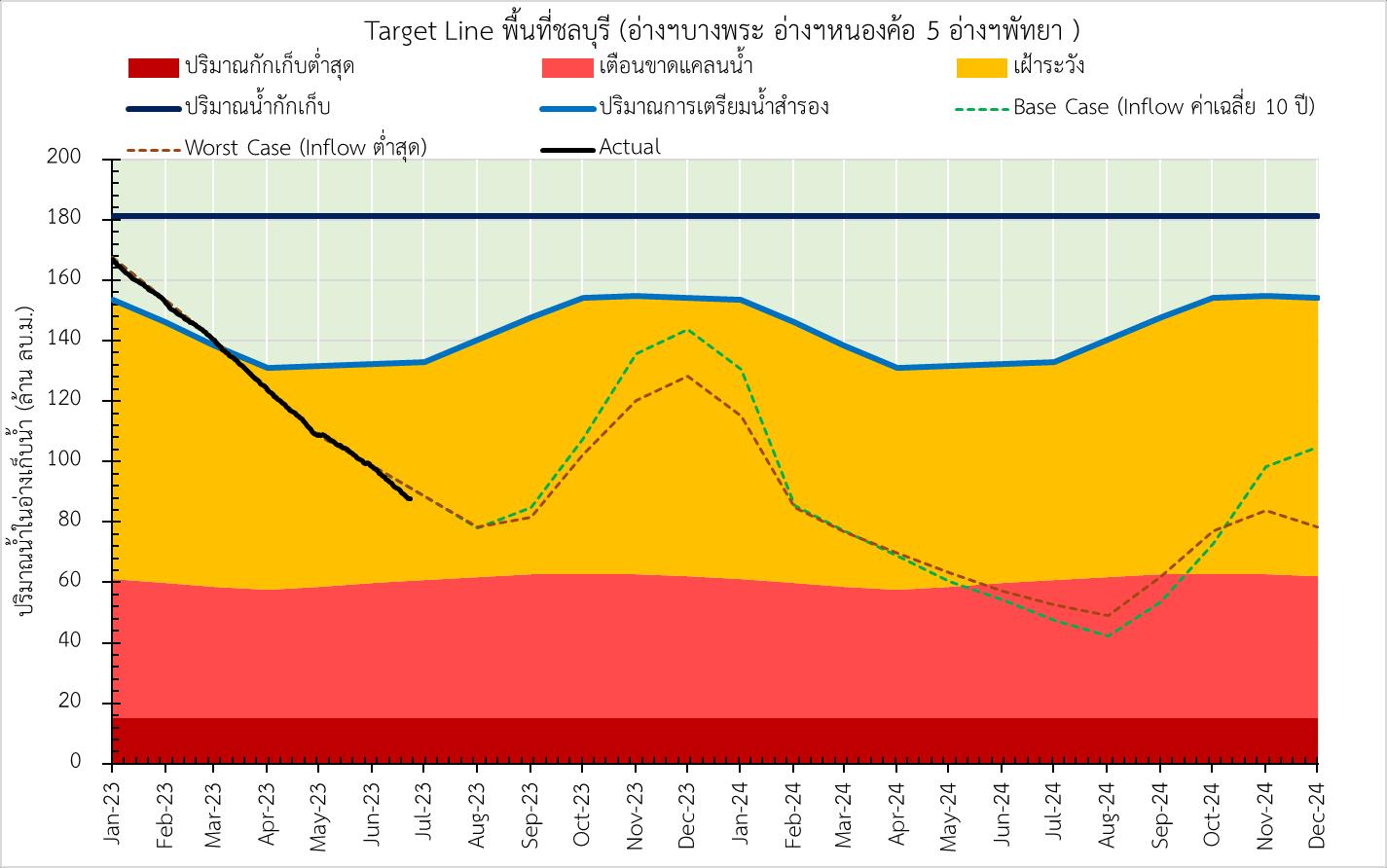้าในอ่างเก็บน้าพืนที่ชลบุรี วันที่ 23 มิ.ย. 66 ปริมาณน้ารวม 2 อ่าง ชลบุรี และ 5 อ่างพัทยา 87.67 ล้าน ลบ.ม. 155 130 สภาวะปกติ All Clear) การเตรียมน้าส้ารอง • ผันน้าบางปะกง / คลองพระองค์ (ตามสถานการณ์น้า) • เพิ่มการผันน้าจากพืนที่ระยอง (ตามสถานการณ์น้า) เฝ้าระวัง เตือนขาดแคลนน้า