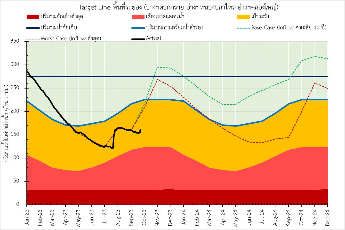 สถานการณ์น้าของอ่างเก็บหนองปลาไหล ม.ค. ก.พ. ม.ค. เม.ย. พ.ค. ม.ย. ก.ค. ส.ค. ก.ย. ต.ค. พ.ย. ธ.ค. 0 20 40 60 80 100 120 140 160 180 200 220 2547 2548 2549 2554 2557 2558 2559 2560 2561 2562 2563 2564 เก็บกัก ต่าสุด เพิ่มความจุเก็บกัก URC - RID LRC - RID เ ลี่ย - 2566 2565 สถานการณ์น้าของ อ่างเก็บน้าหนองปลาไหล ปริมาณน ้าในอ่างเก็บน ้าหนองปลาไหล ( ล้าน ลบ . ม .) 0 50 100 150 200 22 ก.ย. 2566 97.14 ล้าน ลบ.ม. 59.32 % ปริมาณน้าเก็บกัก . ล้าน ลบ.ม. ปริมาณน้าต่าสุด . ล้าน ลบ.ม. URC - RID LRC - RID เ ลี่ย2566 เพมความจชวคราว ปรมาณนาเกบกก . ล้าน ลบ.ม. 2565