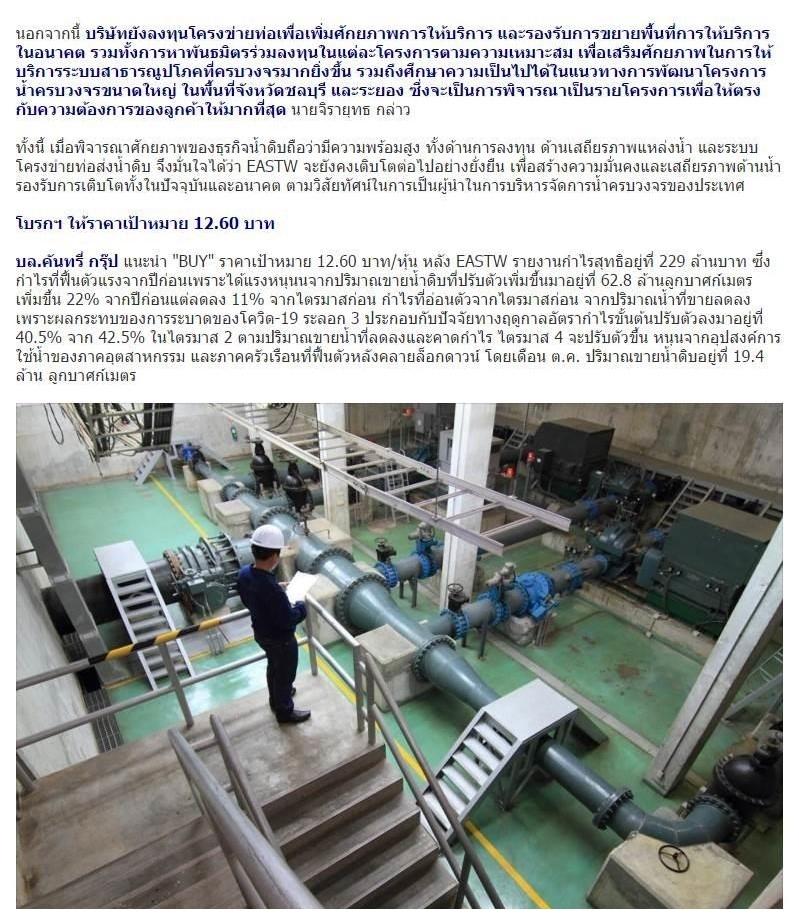 บันทึกไฟล์เมื่อ: พฤหัสบดี 30 ธันวาคม 2564 เวลา 06:52 หัวข้อข่าว: EASTW เผยดีมานด์น้ำดิบเพิ่ม เร่งเจรจาลูกค้าใหม่หนุนผลงานโต รหัสข่าว: I-I211230000429 หน้า: 2/6 mgronline.com Rating: Site Value: 60,000 180,000PRValue (x3)
