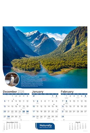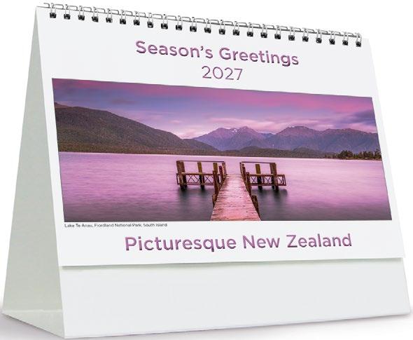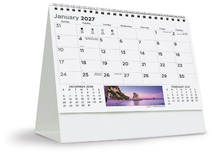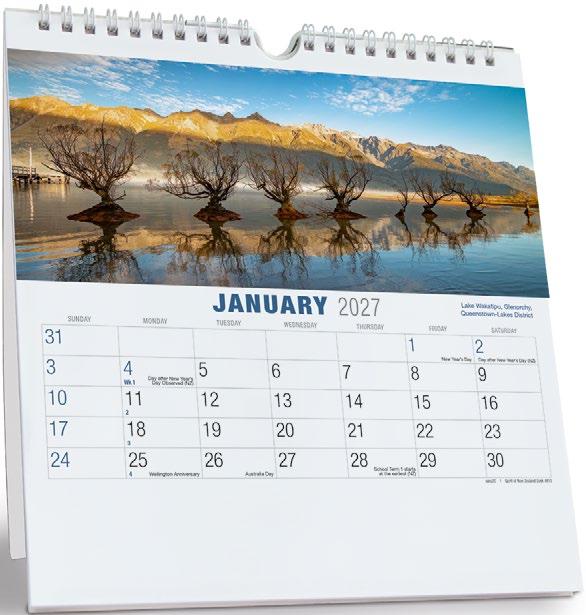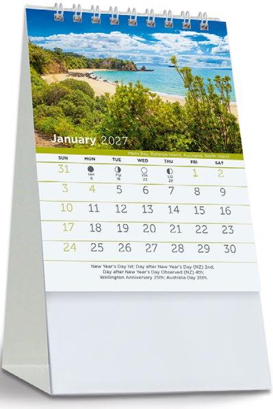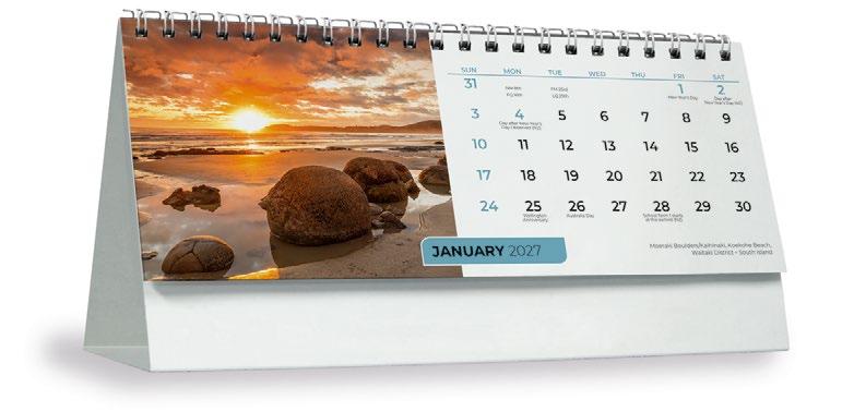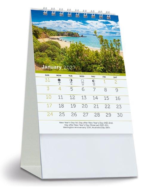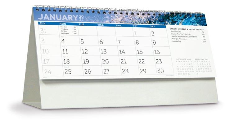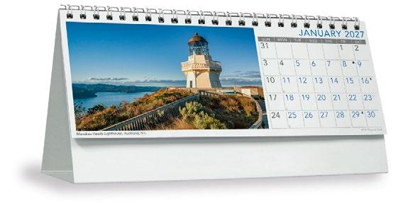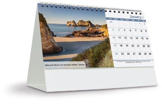 Showcase your brand 365 days a year alongside stunning scenic images from some of New Zealand’s most impressive locations. The functional date grid and a handy year planner will help you stay organised throughout the year.