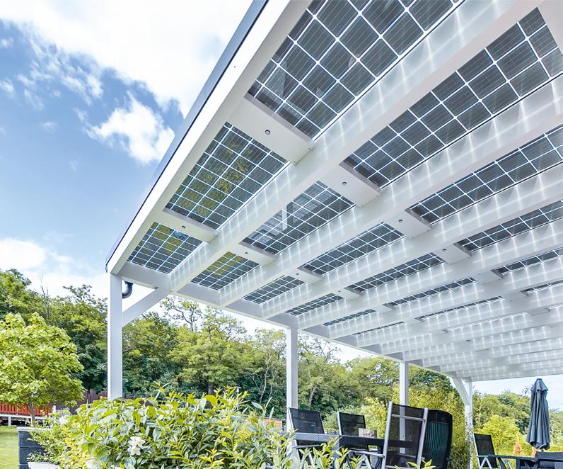 Die transparenten Solarmodule dienen nicht nur als zuverlässiger Sonnenschutz, sondern lassen auch 98 % des natürlichen Tageslichts hindurch. Dadurch entfällt die Notwendigkeit zusätzlicher Sonnensegel oder Markisen und Sie können das angenehme und helle Ambiente Ihrer Terrasse voll auskosten.
