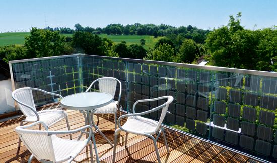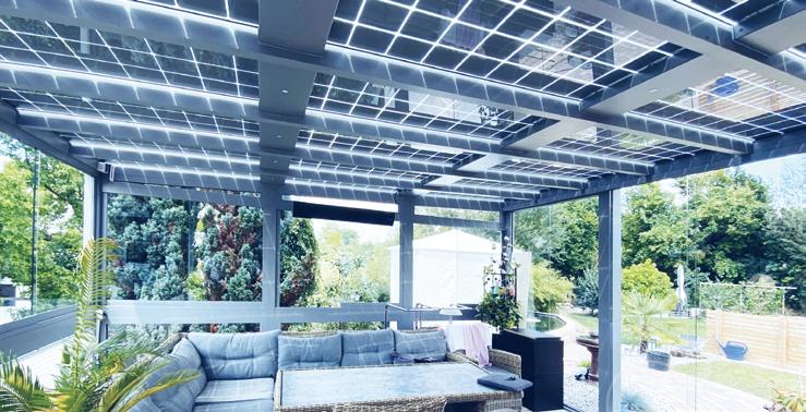 Das Besondere an dieser Eckterrasse sind die maßgefertigten Solarmodule aus Verbundsicherheitsglas, die perfekt in das Design integriert sind.
