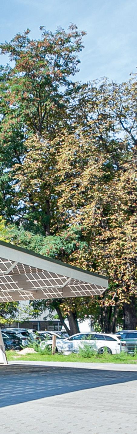 Für viele Unternehmen ist es mittlerweile wichtig, dass Mit arbeiter, Besucher und Kunden auf dem Firmengelände Solarstrom tanken können. Hierzu werden die Wallboxen in den Solarcarports integriert. Auf Wunsch ist die Visuali sierung der erzeugten Solarstrommengen für eine Website, eine Smartphone-APP oder Eingangsbereiche möglich.