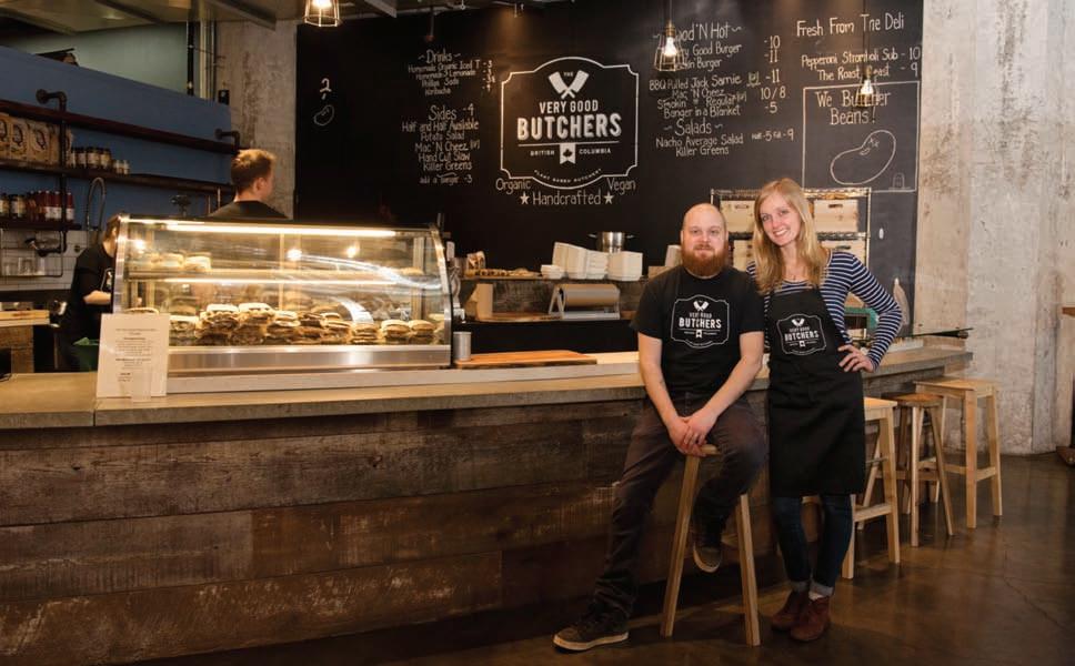 many greenhouse gases as planes, trains and automobiles combined, 18 per cent of the total human-generated CO2 and methane. The latest innovations include the Impossible Burger, which looks, tastes and “bleeds like beef.” It’s designed for meat eaters but is entirely plantbased, relying on a molecule called “heme” for its meaty aromas and appearance. The Impossible Burger is on the menu at Momofuku and other restaurants in L.A. and San Francisco—created by scientists at Impossible Foods, a Silicon Valley start-up with financial backing from Bill Gates. Victoria now has its own plant-based meats butcher, James Davison of The Very Good Butchers in the Hudson Market. Preparing a pulled jackfruit taco, Davison says his vegan butchery is the first of its kind in B.C. Offering “roast beast” (a vegan ham), gluten-free British bangers made with leek, apples and herbs, and meatless Reuben sandwiches, the London-born chef offers a unique experience for the omnivore. Davison believes we all need to eat less meat for the health of the planet— something even the UN is advising—and devises his faux meats using tofu, tempeh and seitan (wheat gluten), spices like paprika and beet juice for meaty colour.