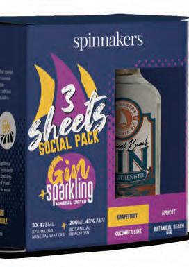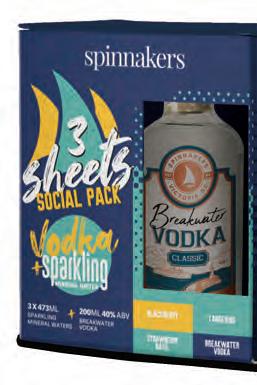 Spinnakers 3 Sheets Social Packs, available in Gin with Grapefruit, Apricot & Cucumber Lime Sparkling Mineral Waters or Vodka with Blackberry, Tangerine & Strawberry Basil Sparkling Mineral Waters.