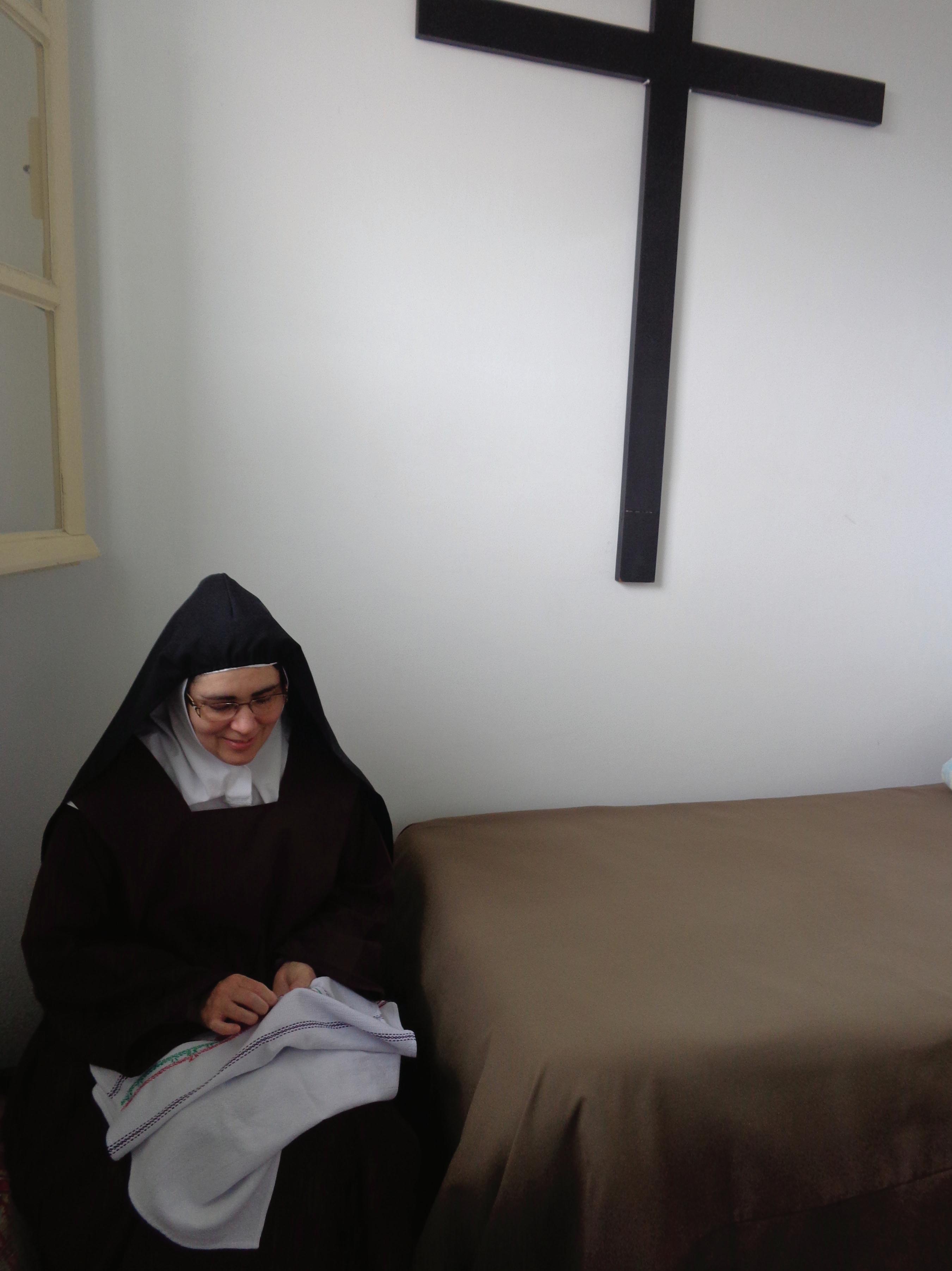 de sala ao lado do altar da capela do carmelo. Uma grade separa as irmãs do espaço da Igreja, que é aberta para o público externo. Lá, elas rezam até as 7 horas, quando o padre chega para rezar a missa. Somente depois da missa é que elas tomam o café da manhã. Em seguida, inicia-se o horário de formação comunitária, que é um espaço do dia destinado à leitura de livros, textos sagrados, documentos da Igreja e do papa. Das 9 às 11 horas é o período de trabalho. “Dentro desse horário, a gente tem a parte tanto da manutenção da casa, limpeza, cozinha, como também costura, bordado, que vão para o nosso bazar, onde nós apresentamos os trabalhos manuais. Cada irmã tem o seu ofício já de manutenção da casa e de trabalhos de confecção para o bazar que temos. São esses trabalhos manuais que garantem a nossa fonte de renda, além dos benfeitores, que são as pessoas que nos ajudam”, explica irmã Margarete. Ainda antes do almoço, as monjas rezam e seguem juntas para o refeitório. Depois, lavam a louça e então inicia o recreio.