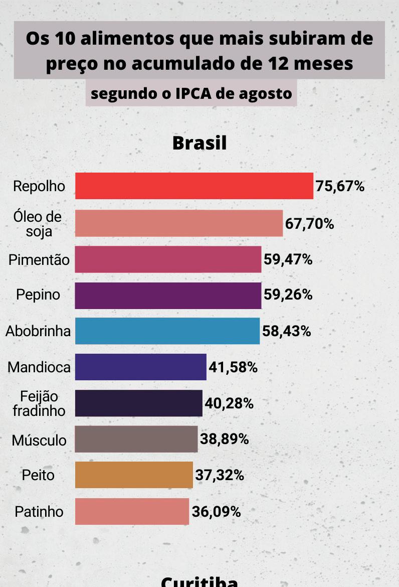 que vem, quando vier a safra nova. Se a colheita for farta e a cotação do dólar estabilizar, o preço dos alimentos pode ficar mais em conta. A questão é a seca: será que vai chover o suficiente para termos uma boa safra? A gente não sabe. Se a colheita for boa, o dinheiro vai render mais no mercado. Se não, o aumento dos preços é certo.” O gráfico confirma esse crescimento, segundo o acumulado de 12 meses dos preços alimentícios do IPCA de agosto.
