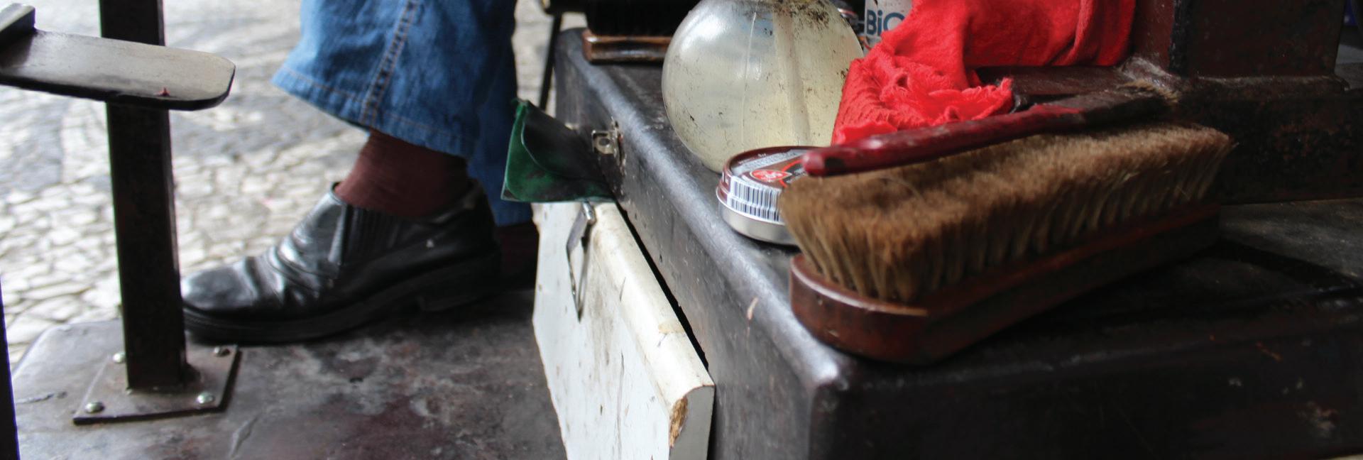 Graxa posta no escovão e, em seguida, nos sapatos à sua frente, dá início aos gestos que entregam o capricho que garante a fidelidade dos amigos-clientes. “Como todo tipo de profissão, se não é bem feita, os clientes não voltam”, ensina o senhorzinho, que do alto de seus 68 anos acumula experiências que vão de vendedor de maçã do amor a segurança de lojasempre engraxando sapatos em paralelo. Hoje, se dedica inteiramente à profissão, mas entende que os anos dourados do serviço já foram: “a crise pegou a gente também”.