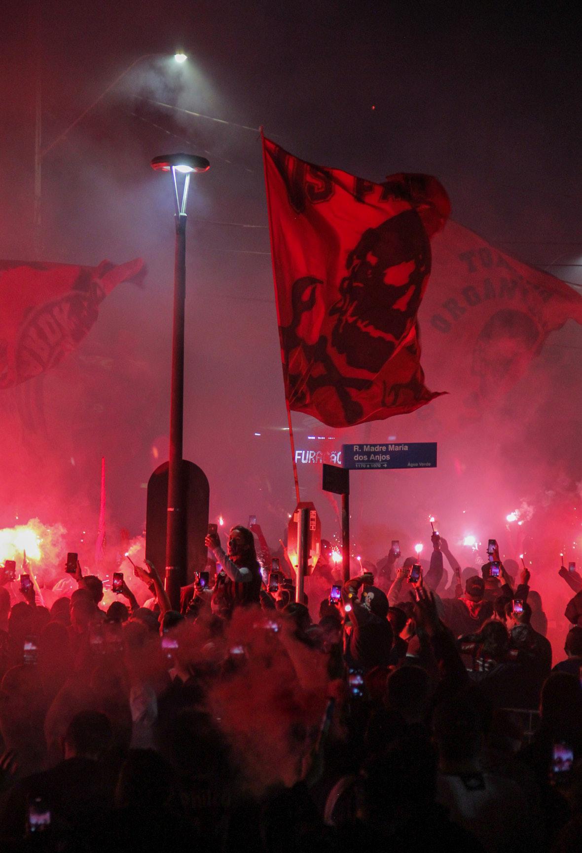 Torcedores com bandeirões na caminhada pela rua Brasílio Itiberê