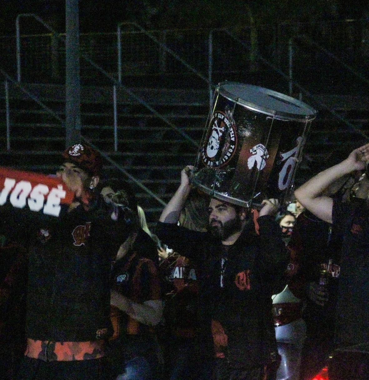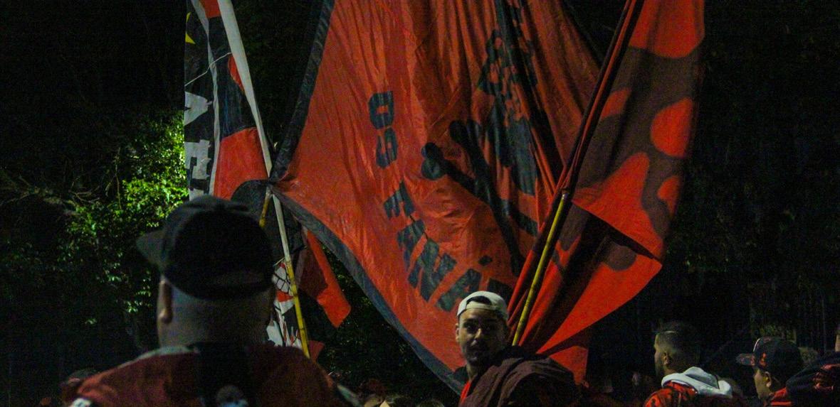 Torcedores carregando faixas e instrumentos para ajudar na torcida