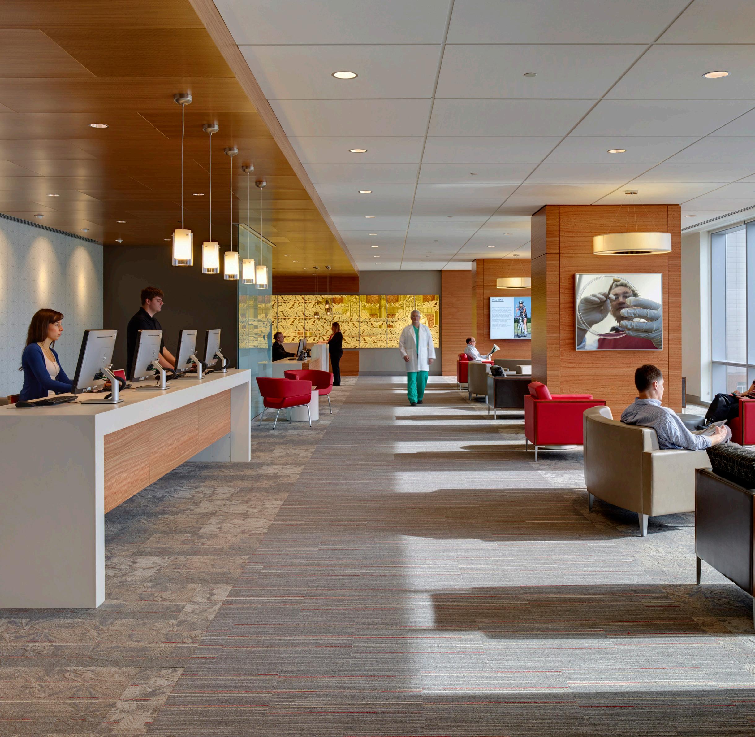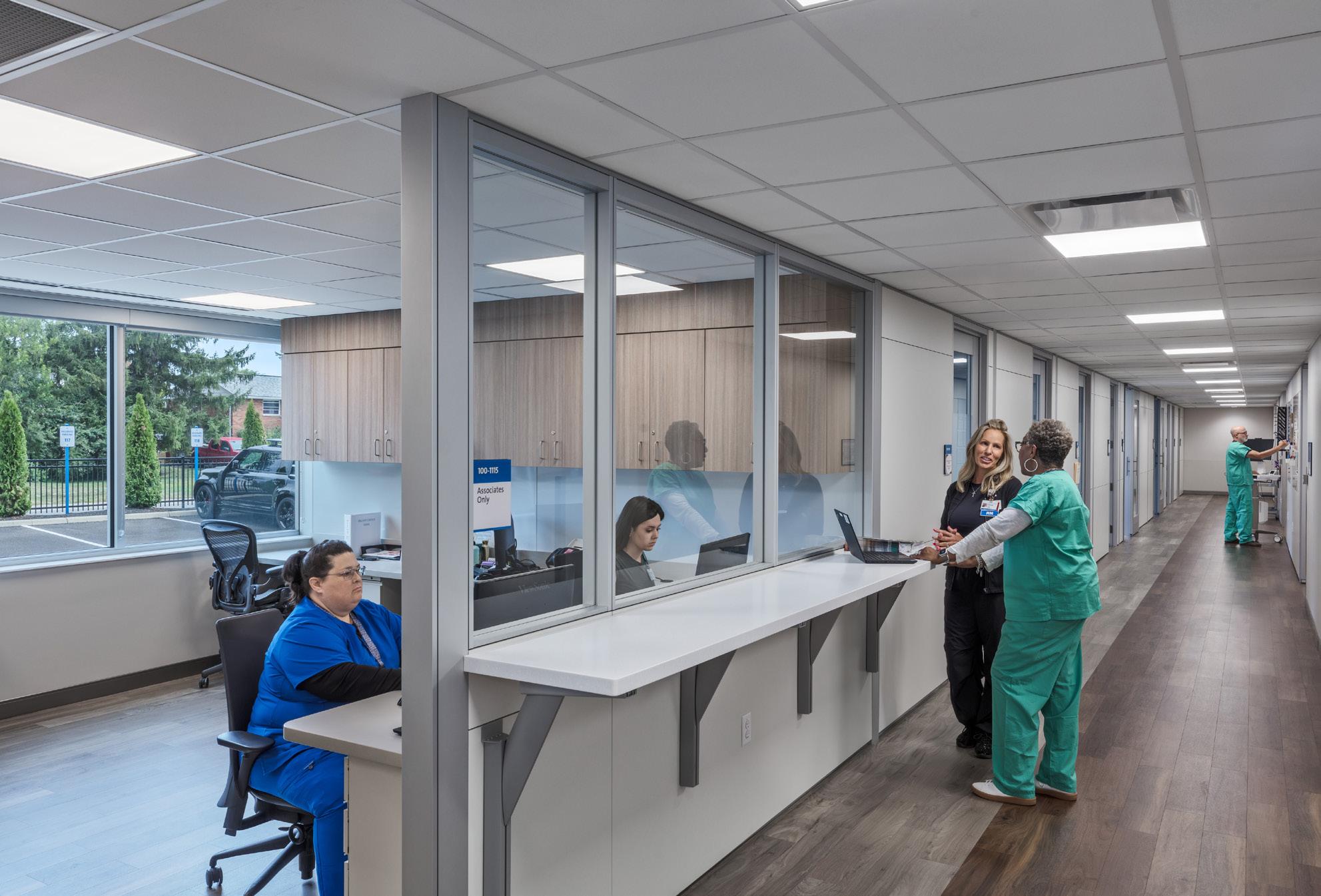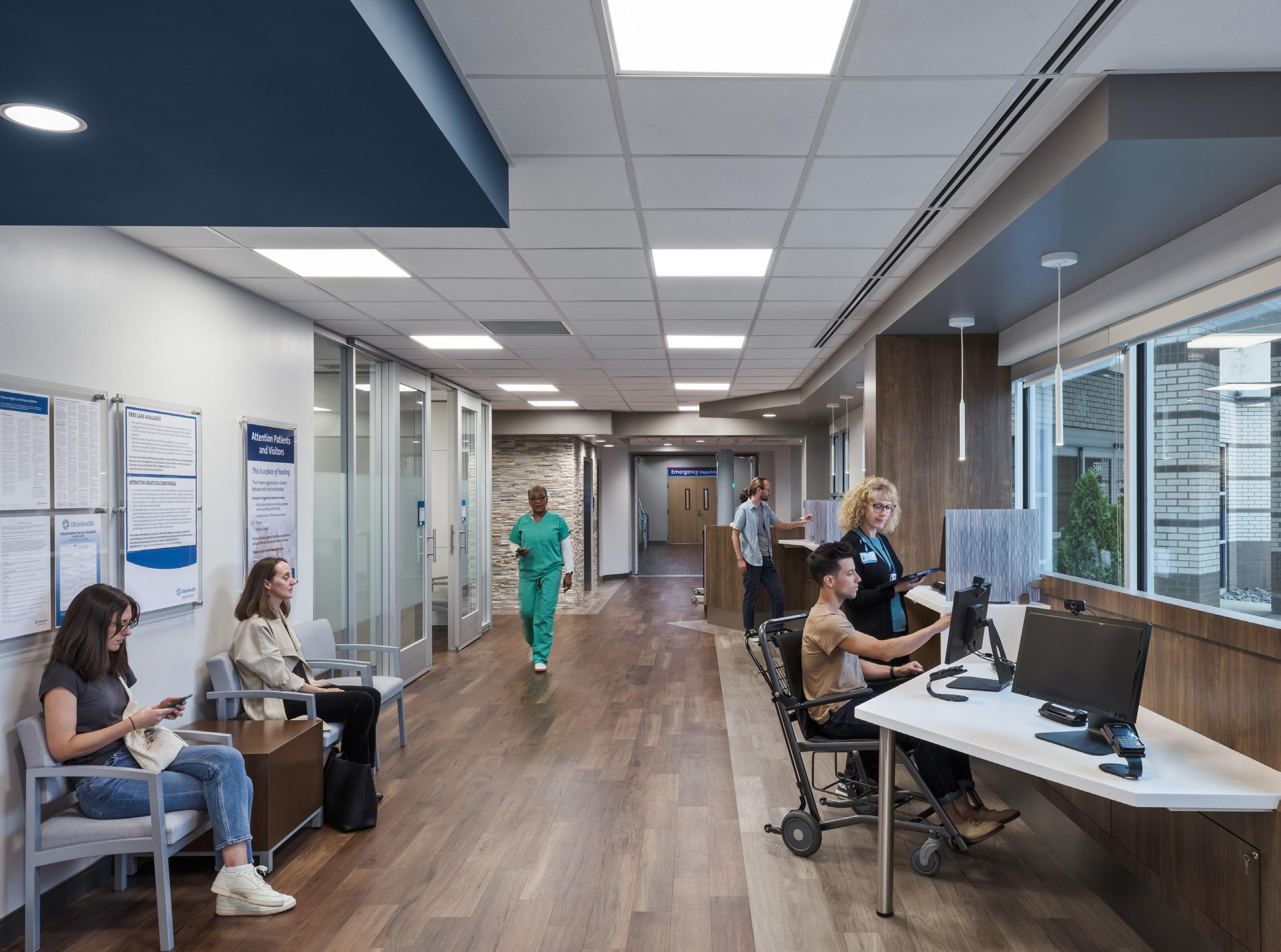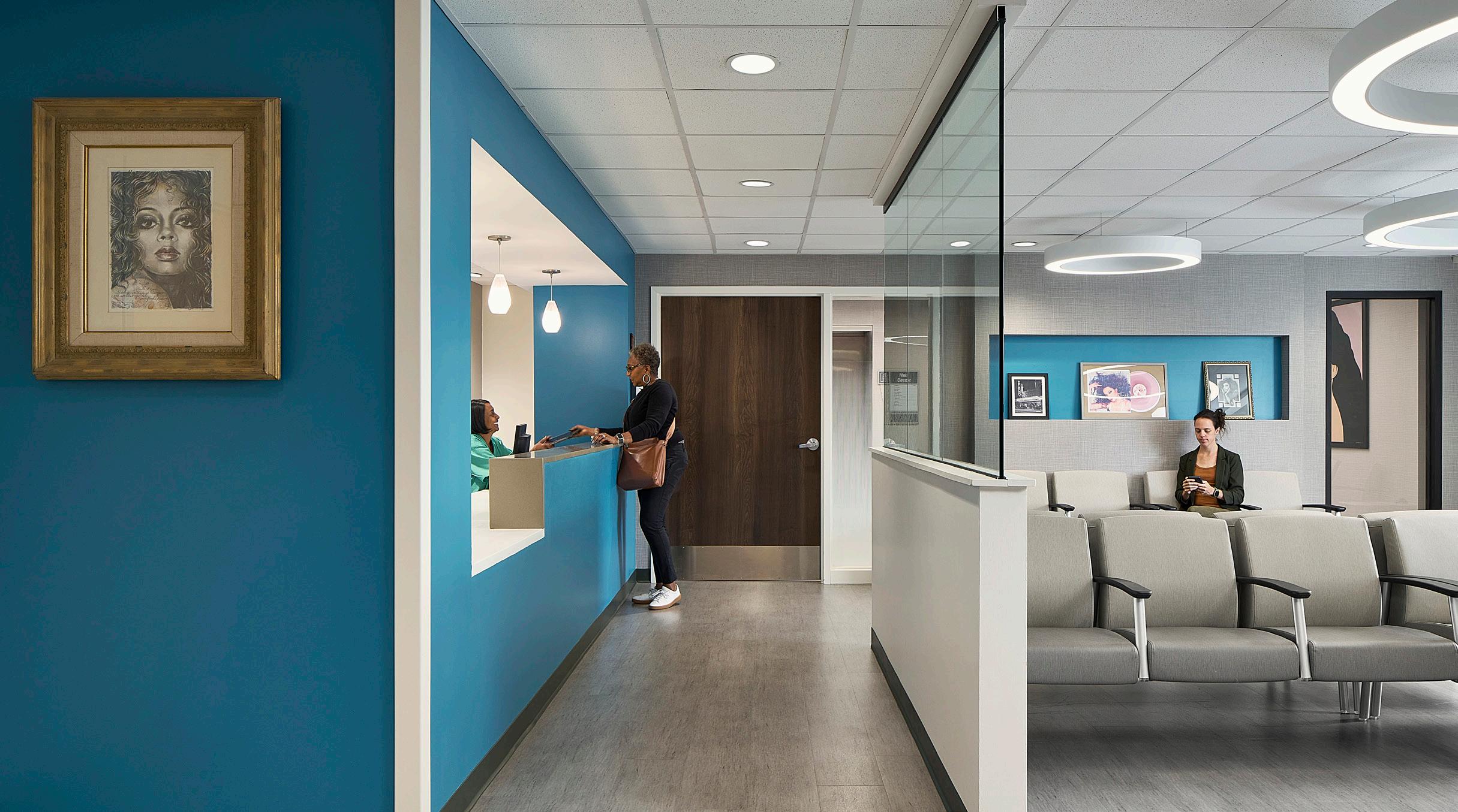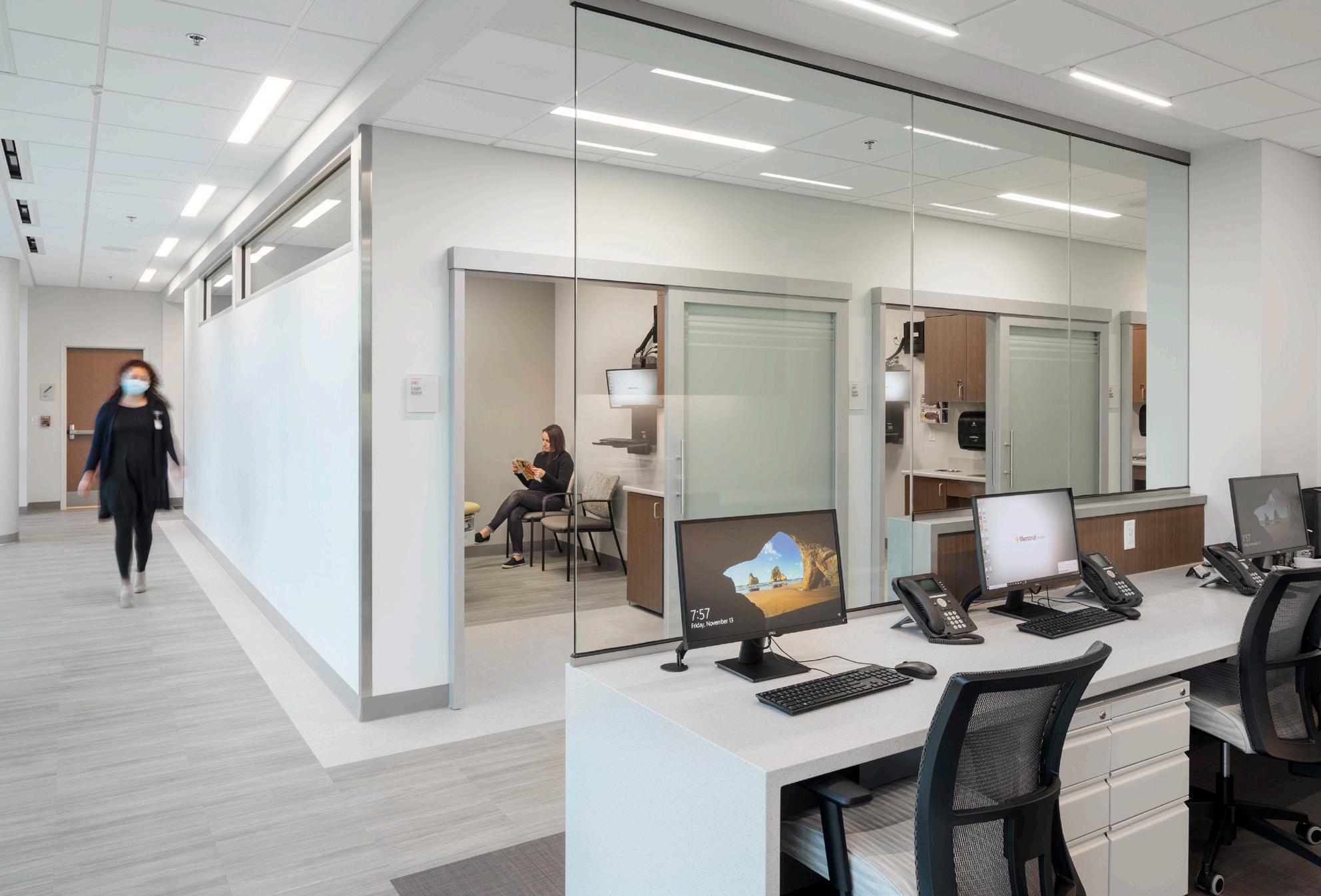 Digital check-in stations allow more square footage to be dedicated to care spaces. Shared waiting and exam rooms with centralized staff hubs allows service lines to flex based on capacity.