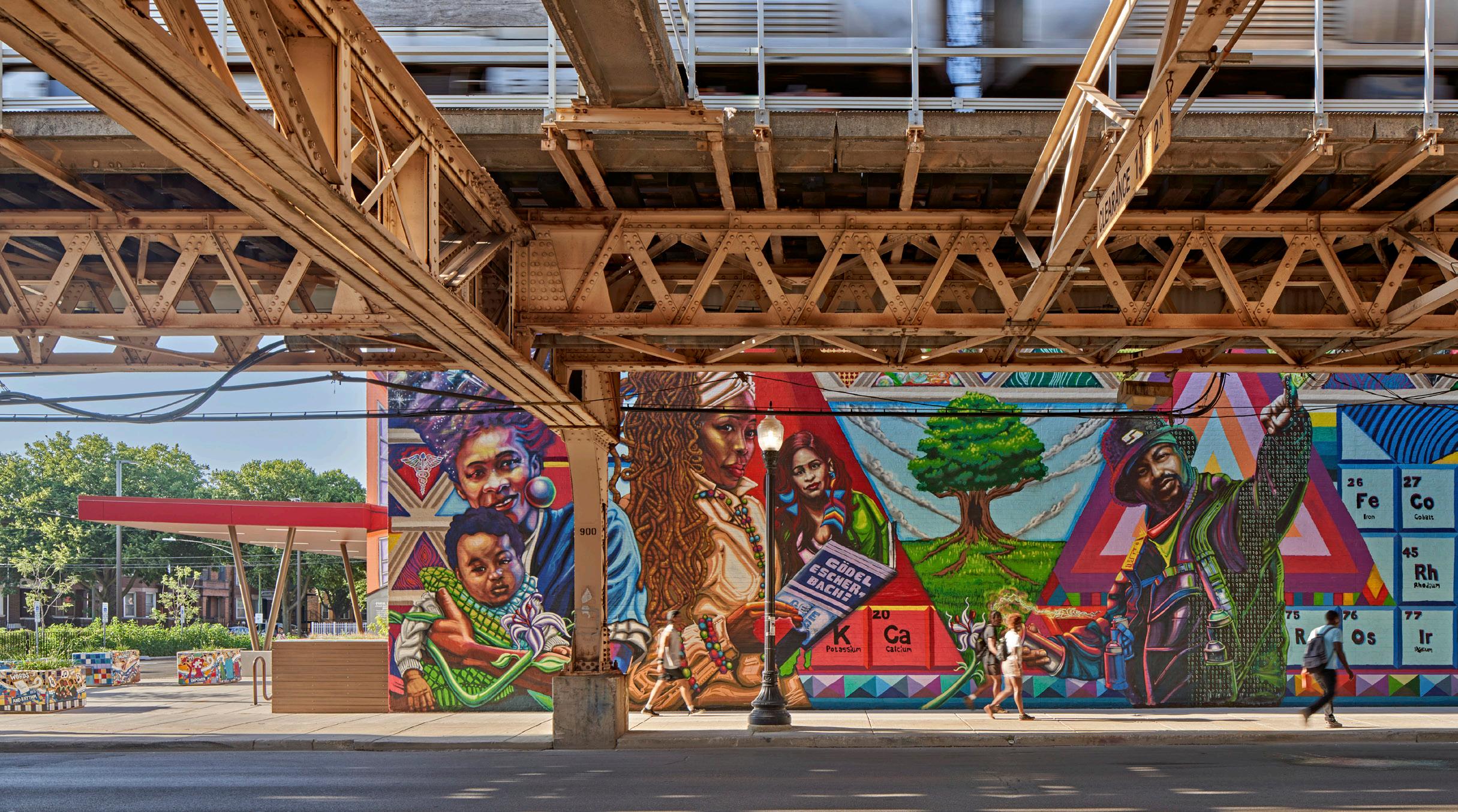 Created by local muralist Rahmaan Statik Barnes, the South facade features the esteemed "living legends" of the community, presenting