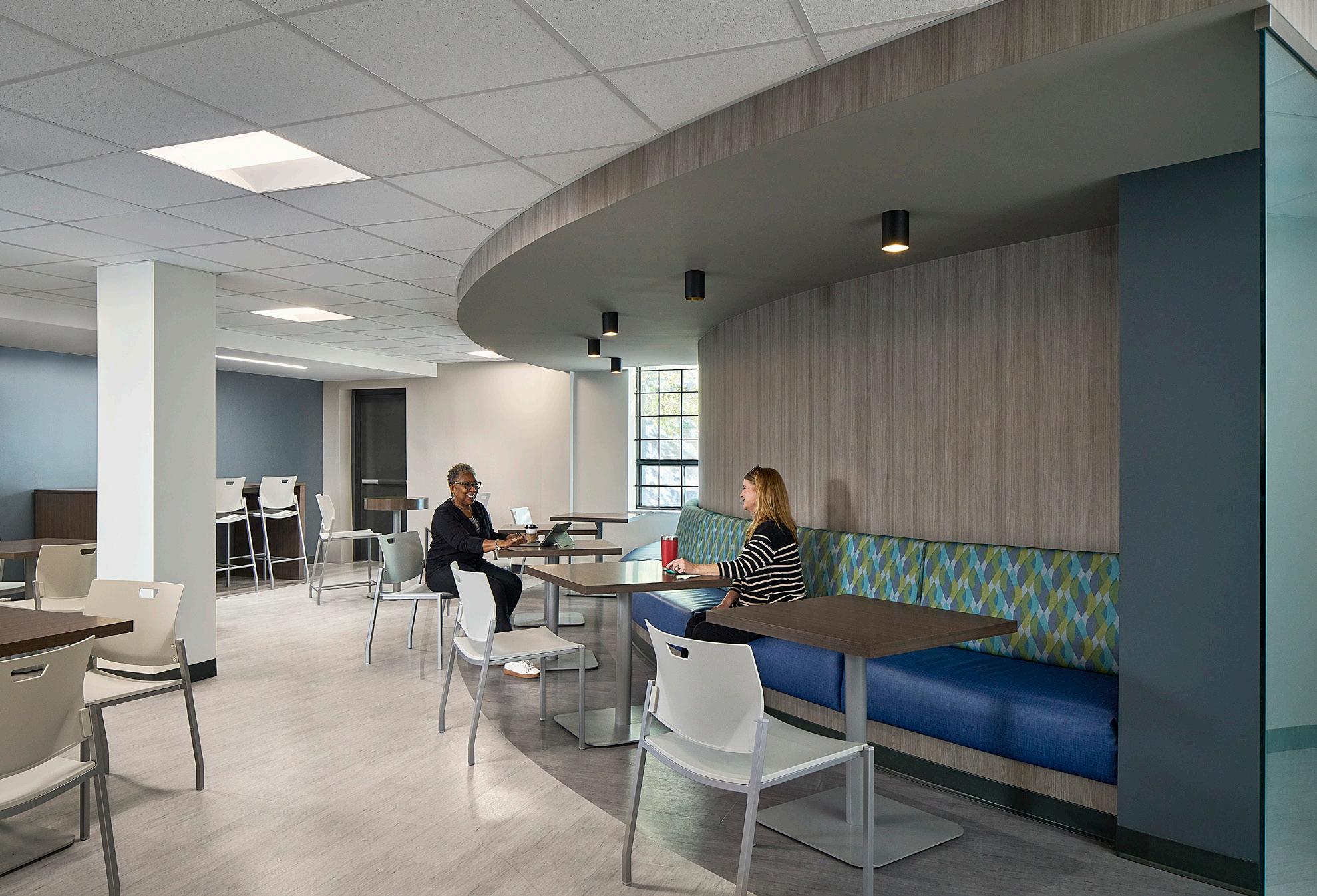 Spaces for staff respite allow care providers to recharge. The cafe provides access to natural light and an outdoor courtyard.