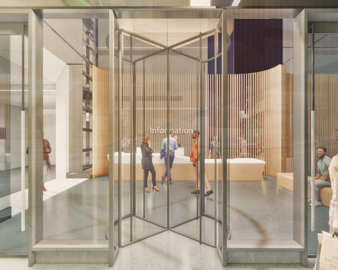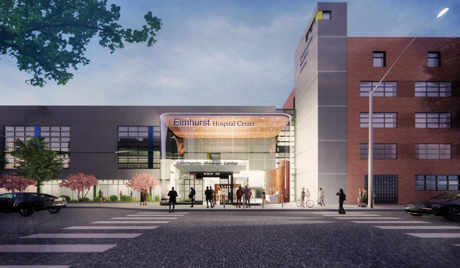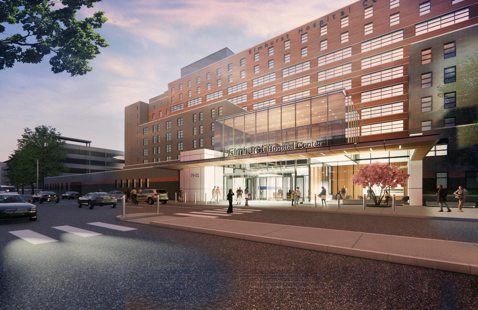 New building entries and reception sequences will improve visibility and patient wayfinding at Elmhurst Hospital.