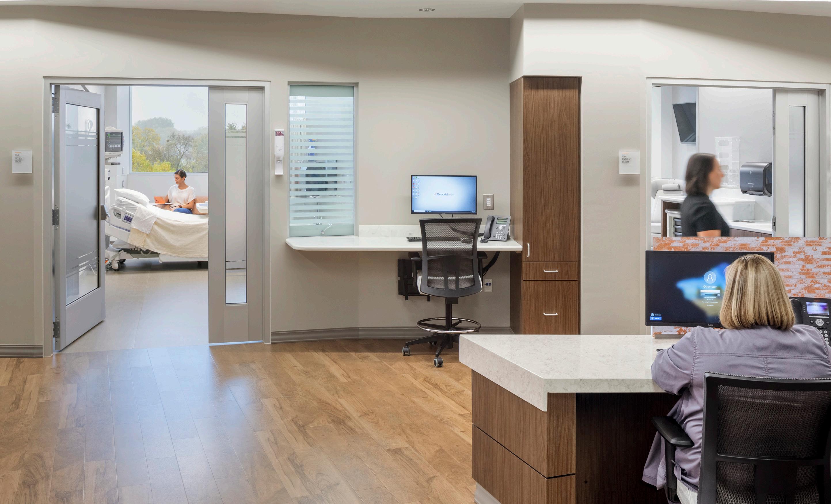 Collaboration is at the forefront of the design, with team spaces on each unit for the physicians and nurses to discuss cases in a focused space, steps from the exam or infusion rooms.