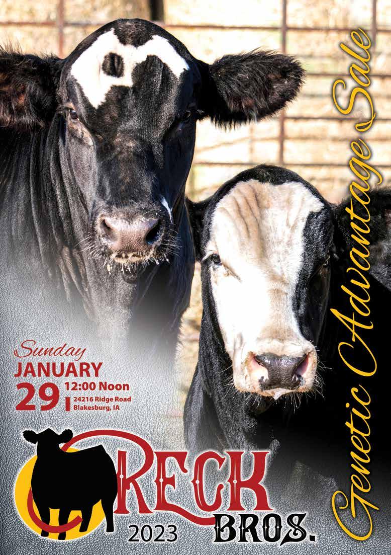 The 6th Annual Reck Brothers Genetic Advantage Sale took place on Sunday, January 29, 2023, at the farm near Blakesburg, Iowa. The sale consisted of a deep set of bred heifers as well as strong aged and yearling herd bulls. Buyers and bidders attended in person and online from all over the country.