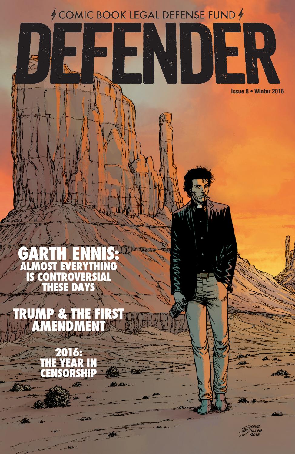 Director’s Note One step forward, two steps back. That phrase encapsulated the prevailing mood of many following the election of Donald Trump. His campaign statements against free press, peaceful protest, and the exercise of religion represent a slur upon the freedoms guaranteed by the First Amendment that is unprecedented in American presidential politics. As I write this during Thanksgiving week, the President-Elect is moderating his views in some areas, so there’s cause to be open-minded about how his Justice Department will view the First Amendment. But vigilance is required. On page 3, we take a first look at “Free Expression in Trump’s America,” and some local incidents that we hope are outliers but acknowledge may be representative of threats to come. While we’re uncertain about how the new administration will behave, we can take some comfort in the vast steps forward comics and free expression have taken in 2016. On page 5, we’re proud to report a victory in a suit we brought against an unconstitutional Internet law in Louisiana that would have had negative consequences for retailers and artists. On that same page, we proudly congratulate Congressman John Lewis, Andrew Aydin, and Nate Powell on winning the National Book Award for March Book Three, and a new documentary on Mike Diana achieving the funding to ensure its release. These projects are boosting the profile of comics in popular culture, and we vigorously applaud them. We also look back at the many, many achievements, legal and educational, that CBLDF achieved in 2016 thanks to your support on pages 9–11. These victories are welcome, but they come in a climate filled with many challenges to fight. On page 5, we link to an important advisory we created for California retailers, unpacking what a new, seemingly overbroad, law governing the sale of autographs means for them. Page 4 spotlights recent attacks on comics and books, including a challenge to the graphic novel Mangaman in the Seattle area. On page 12–13, we survey recent “International Incidents” of creators, editors and administrators facing intimidation, jail, and in one horrible case, murder, for exercising free speech. These are the kinds of incidents that make the First Amendment such a valuable freedom—they don’t happen here. But this is why we fight, to ensure those rights never erode. We close the year by chatting with one of our favorite supporters, Garth Ennis, who shares his sharp observations about politics and censorship along with comments about his favorite stories to write on pages 6–7. Finally, we say goodbye to Steve Dillon, who provided this issue’s cover. Steve was a big-hearted man whose kindness and devotion to CBLDF will be eternally appreciated. CBLDF’s work is more relevant than ever. We hope we can count on your support as we prepare for a busy 2017. —Charles Brownstein, Executive Director