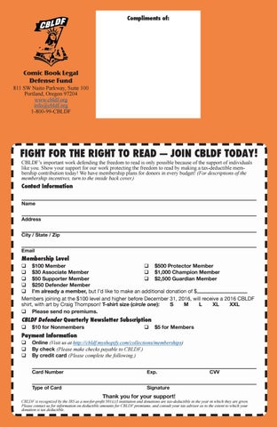 FIGHT FOR THE RIGHT TO READ — JOIN CBLDF TODAY! CBLDF’s important work defending the freedom to read is only possible because of the support of individuals like you. Show your support for our work protecting the freedom to read by making a tax-deductible membership contribution today! We have membership plans for donors in every budget! (For descriptions of the membership incentives, turn to the inside back cover.)
