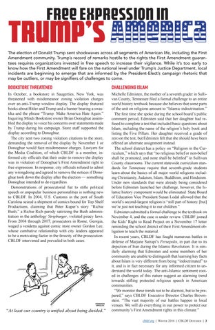 Michelle Edmisten, the mother of a seventh grader in Sullivan County, Tennessee filed a formal challenge to an entire world history textbook because she believes that some parts of the unit on religions amount to “Islamic indoctrination.” The first time she spoke during the school board’s public comment period, Edmisten said that her daughter had refused to complete a test that included basic questions about Islam, including the name of the religion’s holy book and listing the Five Pillars. Her daughter received a grade of zero on the test, but Edmisten felt that she should have been offered an alternate assignment instead. The school district has a policy on “Religion in the Curriculum,” which says that “no religious belief or non-belief shall be promoted, and none shall be belittled” in Sullivan County classrooms. The current statewide curriculum standards for Tennessee require that seventh-grade students learn about the basics of all major world religions including Christianity, Judaism, Islam, Buddhism, and Hinduism. Under new standards that were already being considered before Edmisten launched her challenge, however, the Islamic history component would be eliminated. State Board of Education Vice President Susan Lodal allowed that the world’s second-largest religion is “still part of history [but] we’re just not teaching it to our children.” Edmisten submitted a formal challenge to the textbook on November 4, and the case is under review. CBLDF joined the Kids’ Right to Read Project on a November 17 letter reminding the school district of their First Amendment obligation to teach the material. In recent years, CBLDF has fought numerous battles in defense of Marjane Satrapi’s Persepolis, in part due to its depiction of Iran during the Islamic Revolution. It is similarly alarming that Edmisten and some members of her community are unable to distinguish that learning key facts about Islam is very different from being “indoctrinated” to it, and is in fact necessary for any informed citizen to understand the world today. The anti-Islamic sentiment rooted in challenges of this nature suggest an alarming trend towards stifling protected religious speech in American communities. “We monitor these trends not to be alarmist, but to be prepared,” says CBLDF Executive Director Charles Brownstein. “The vast majority of our battles happen in local venues. We will do everything in our power to protect our community’s First Amendment rights in this climate.” cbldf.org | Winter 2016 | CBLDF Defender | 3