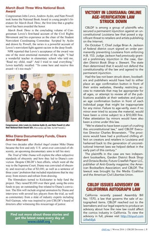 CBLDF ISSUES ADVISORY ON CALIFORNIA AUTOGRAPH LAW California recently passed Assembly Bill No. 1570, a law that governs the sale of autographed items. CBLDF reached out to the lawmakers and our legal experts to produce an advisory about how the new law could affect the comics industry in California. To view the advisory in full, please visit http://tinyurl.com /z9wh8y6 cbldf.org | Winter 2016 | CBLDF Defender | 5