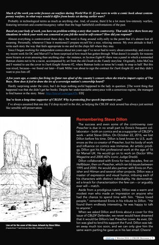 The success and even some of the controversy over Preacher is due in no small part to Ennis’s frequent collaborator – both on comics and as a supporter of CBLDF’s work – artist Steve Dillon. On October 22, 2016, we lost Dillon before his time. Dillon is best known to U.S. audiences as the co-creator of Preacher, but his body of work and influence on comics was immense. An artistic prodigy, Dillon got his first professional work at the age of 16 for Marvel UK. He would go on to work on Doctor Who Magazine and 2000 AD’s iconic Judge Dredd. Dillon collaborated with Ennis for two decades, first on Hellblazer, then on Preacher, which ran 66 issues between 1995 and 2000. He would also partner with Ennis on Punisher and Hitman and several other projects. Dillon was a master of expression and visual humor, imbuing each of his characters with distinct individuality. He demonstrated a knack for characterization the few can – or arguably ever will – match. Aside from a prodigious talent, Dillon was a warm and modest man who made an impression on anyone who had the chance to spend time with him. “Steve loved people,” remembered Ennis in his tribute to Dillon. “He found them endlessly interesting, he was happy to talk to anyone.” When we asked Dillon and Ennis about a cover for this issue of CBLDF Defender, we never would have dreamed that it would be Dillon’s last Preacher cover. As ever, Dillon was glad to lend his support the Fund. Dillon was taken away much too soon, and we can only give him the same warm parting he gave us in his last email: Cheers! cbldf.org | Winter 2016 | CBLDF Defender | 7