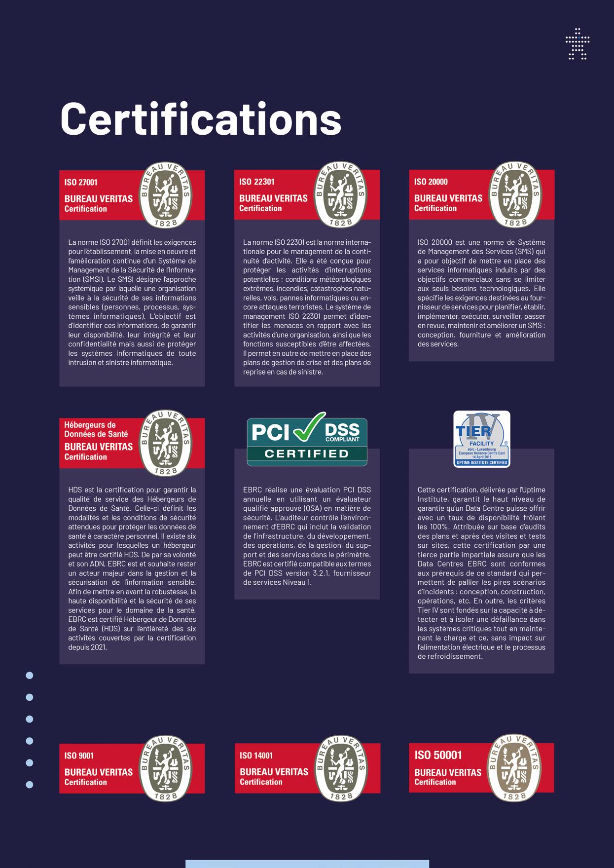 et nécessitent des solutions d’infrastructure hautement sécurisées, fiables et flexibles. Avoir un partenaire en cybersécurité comme EBRC était pour nous un choix logique. Titulaire des certifications HDS (Hébergement des données de santé), ISO 27001 (gestion de la sécurité de l’information) et ISO 22301 (gestion de la continuité des activités), EBRC répond parfaitement aux exigences du secteur de la santé. De plus, l’entreprise propose les data centers les plus sécurisés d’Europe (Tier IV) et une infrastructure cloud résiliente, tous deux disponibles 24h/24 et 7j/7.