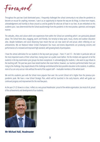 Foreword Throughout the past two Covid dominated years, I frequently challenged the school community to not allow the pandemic to become an excuse for anything; moreover, I saw it as an opportunity to improve the way we do things, to show more respect, acknowledgement and humility to those around us and be grateful for what we all have in our lives. As we embarked on this academic year, I was determined that the School would emerge from the pandemic in the most positive, optimistic and energetic manner. The attitudes, ethos and culture which one experiences from within the School are something which I am particularly pleased about. The School feels alive, engaging, warm and friendly. Our tenacity to keep sport, music, drama and outdoor education alive, despite lockdowns and social distancing have meant that we can now stand tall and proud, when reflecting on our achievements. We are National Indoor Cricket Champions! Our music and drama departments are producing concerts and performances of a renewed and improved high standard, with growing levels of participation. I have the utmost admiration for our students in the key exam year groups – Years 11 and 13 – the latter in particular who sat the most important exams of their school lives, having never sat a public exam before. Yet the mindset and approach of all the students in the key examination year groups has been exceptional. In acknowledging the students, I also want to pay tribute to the teaching staff. The past two years have tested teachers like never before; however, our teachers performed better than just rising to the challenge, they stayed ahead of the challenge and delivered the best possible education to the students. In addition, none of us can carry out our roles without the work of the support staff – invaluable members of the whole team! We end this academic year with the School more popular than ever: the current School roll is higher than the previous prepandemic peak. We have a new School Strategic Plan, which will be launched in the early Autumn, which will guide our continued progress and improvement for the next few years. As the year 21-22 draws to a close, I reflect as a very proud Headmaster: proud of the whole organisation, but most of all, proud of the achievements and development of our students.