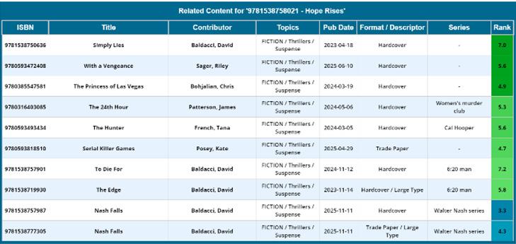 Related Content shows titles from your library’s collection that had similar circulation patterns to the title being viewed. It provides evidence supporting the predicted rank by answering: