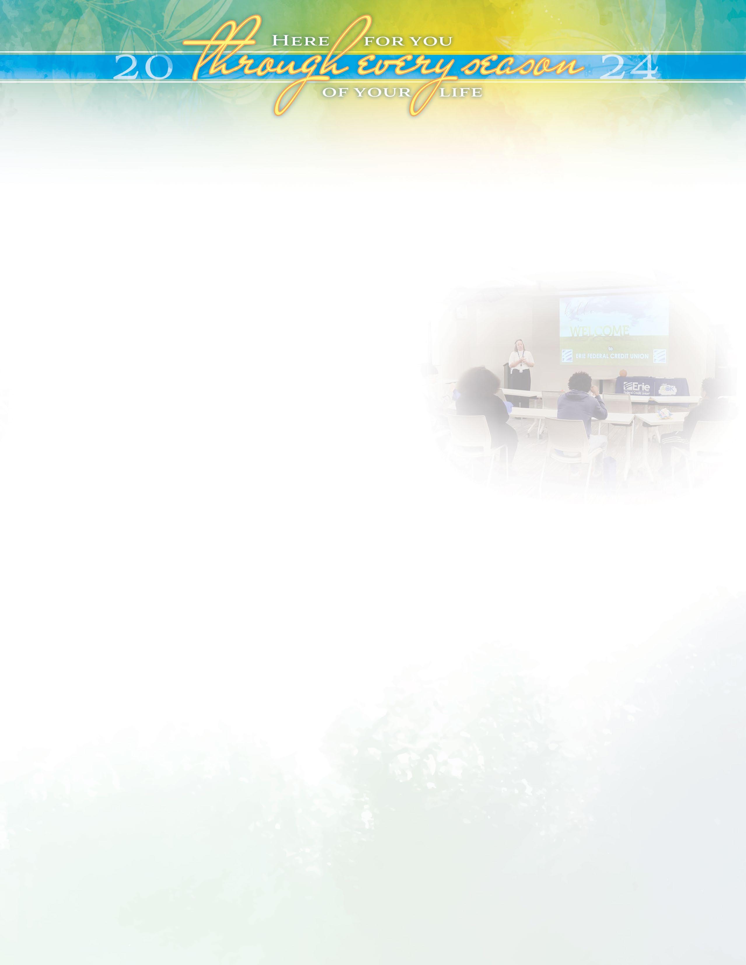 REPORT OF THE BOARD OF DIRECTORS (continued from page 5). We hope you’ll embrace the benefits of your credit union membership by utilizing the many top-notch products and services we have available. Rest assured your well-being always comes first at Erie FCU, and everything we offer is provided with one simple goal – to support your financial success. I invite you to review the entire report for additional details on the great work your credit union is doing.