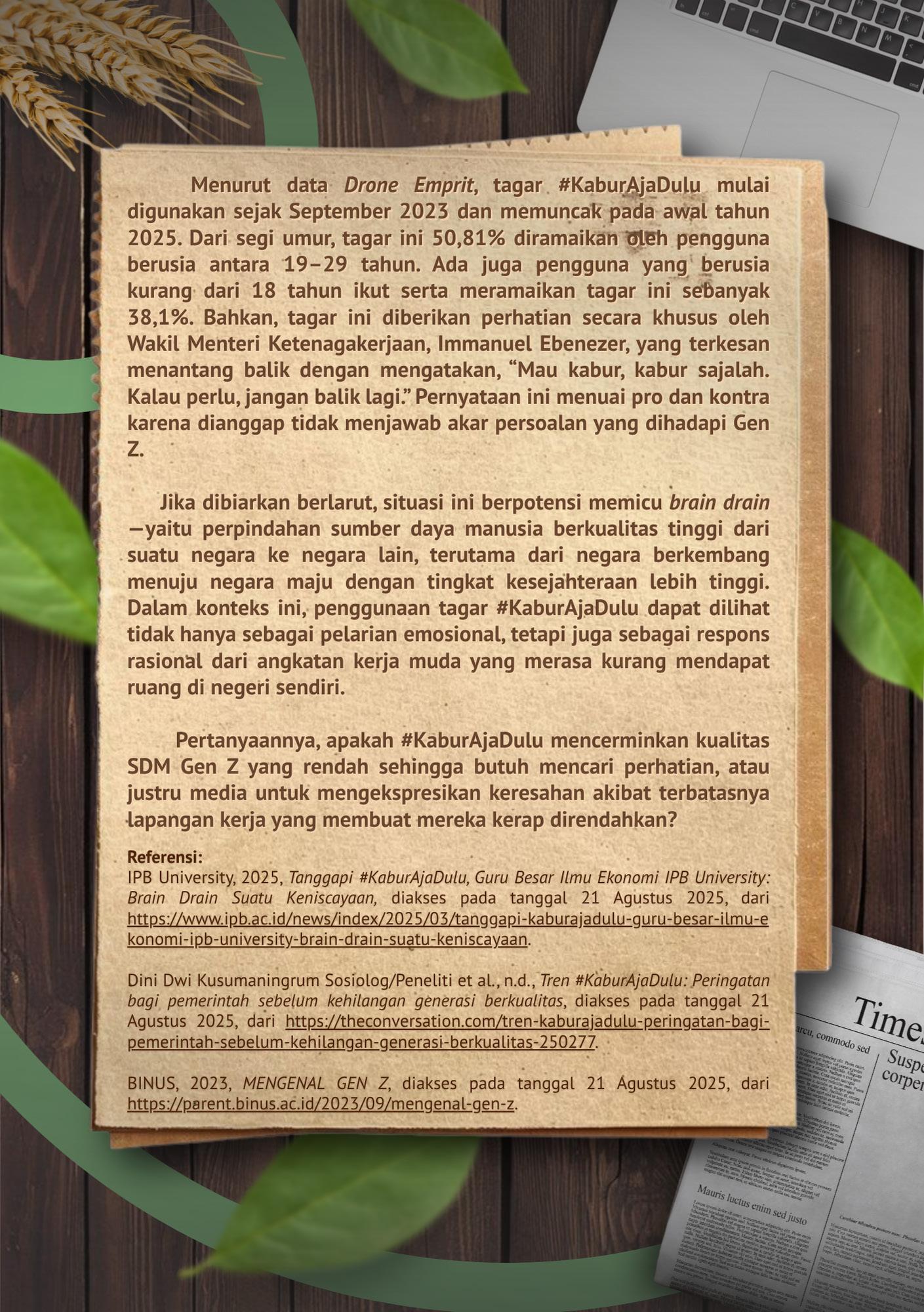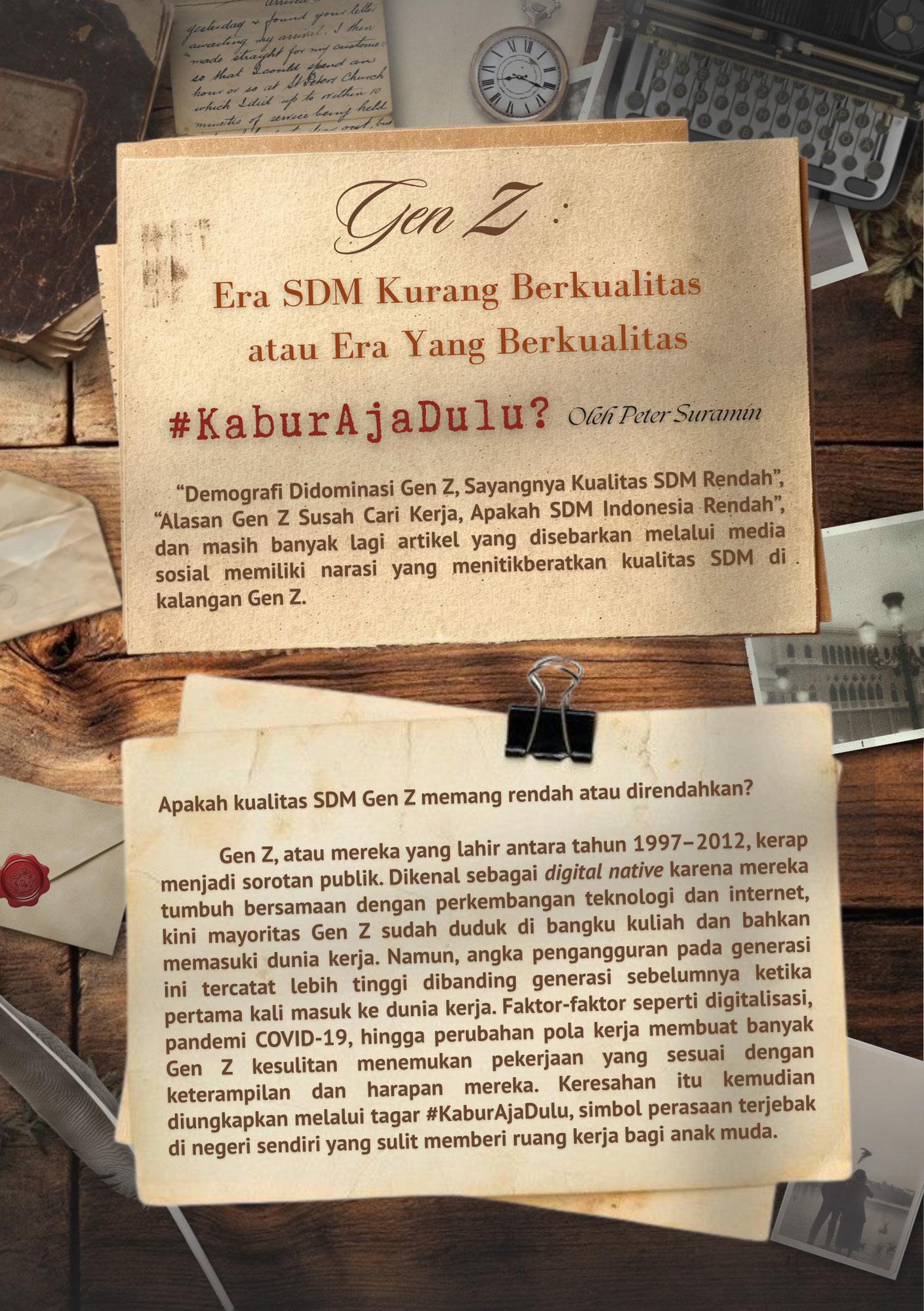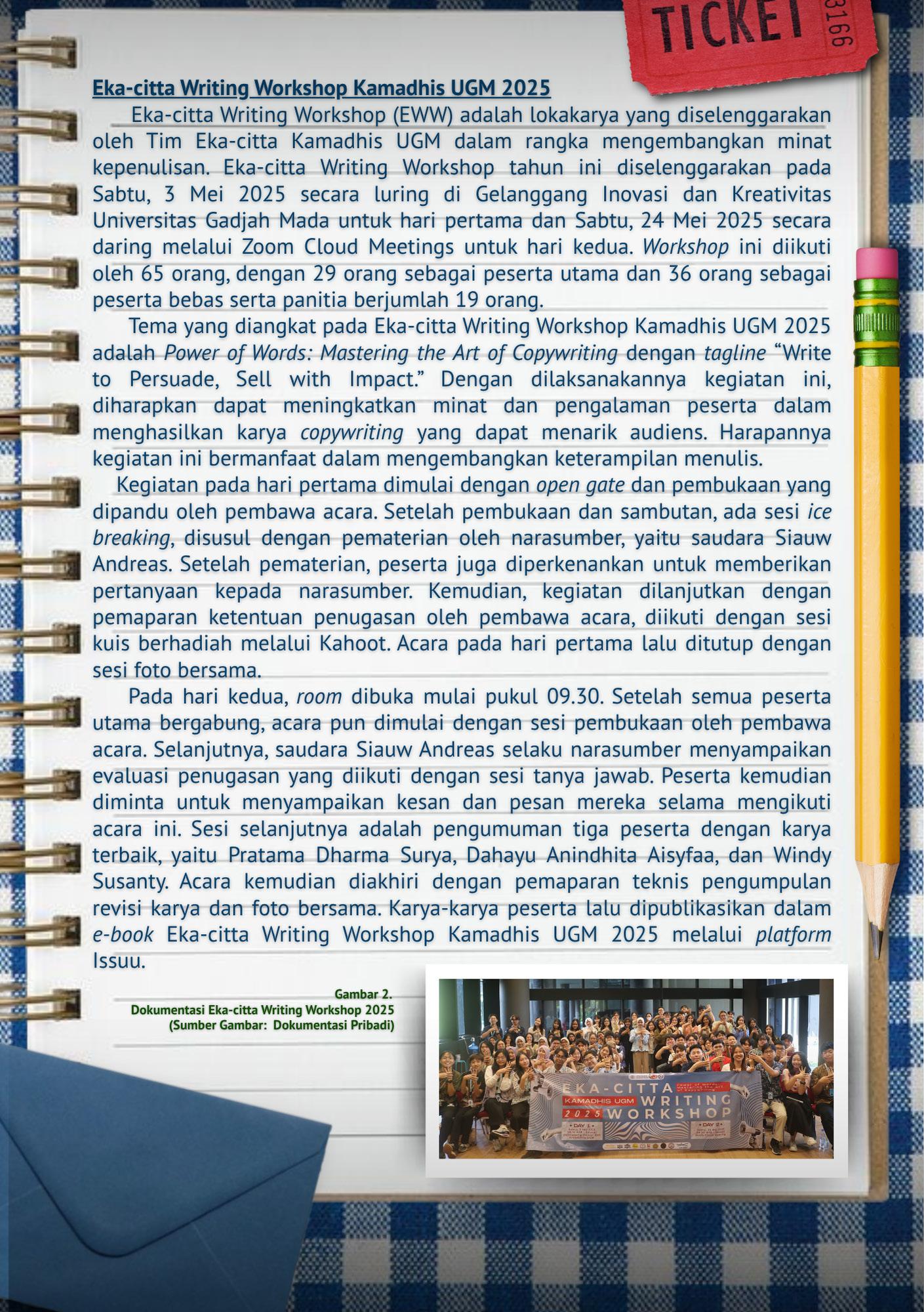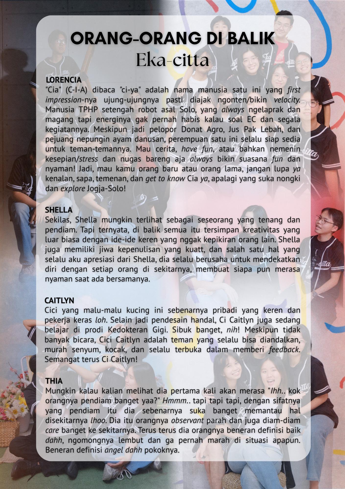 “Pioneering Hope Amid Global Challenges: What’s on Gen Z’s Mind?” adalah tema yang diangkat pada Eka-citta edisi LXIII. Tema ini bertujuan untuk menyuarakan pemikiran Gen Z—tak hanya keluhan, melainkan juga harapan, inisiatif, dan sudut pandang generasi muda dalam menanggapi dunia yang kian kompleks. Melalui Eka-citta edisi LXIII, kita akan menguak berbagai permasalahan yang tengah dihadapi Gen Z, mulai dari penerjunan ke dunia kerja, pendidikan berkualitas, kepemimpinan di tengah berbagai tantangan global, krisis iklim, disrupsi ekologi, hingga ketidakstabilan politik dan ekonomi.