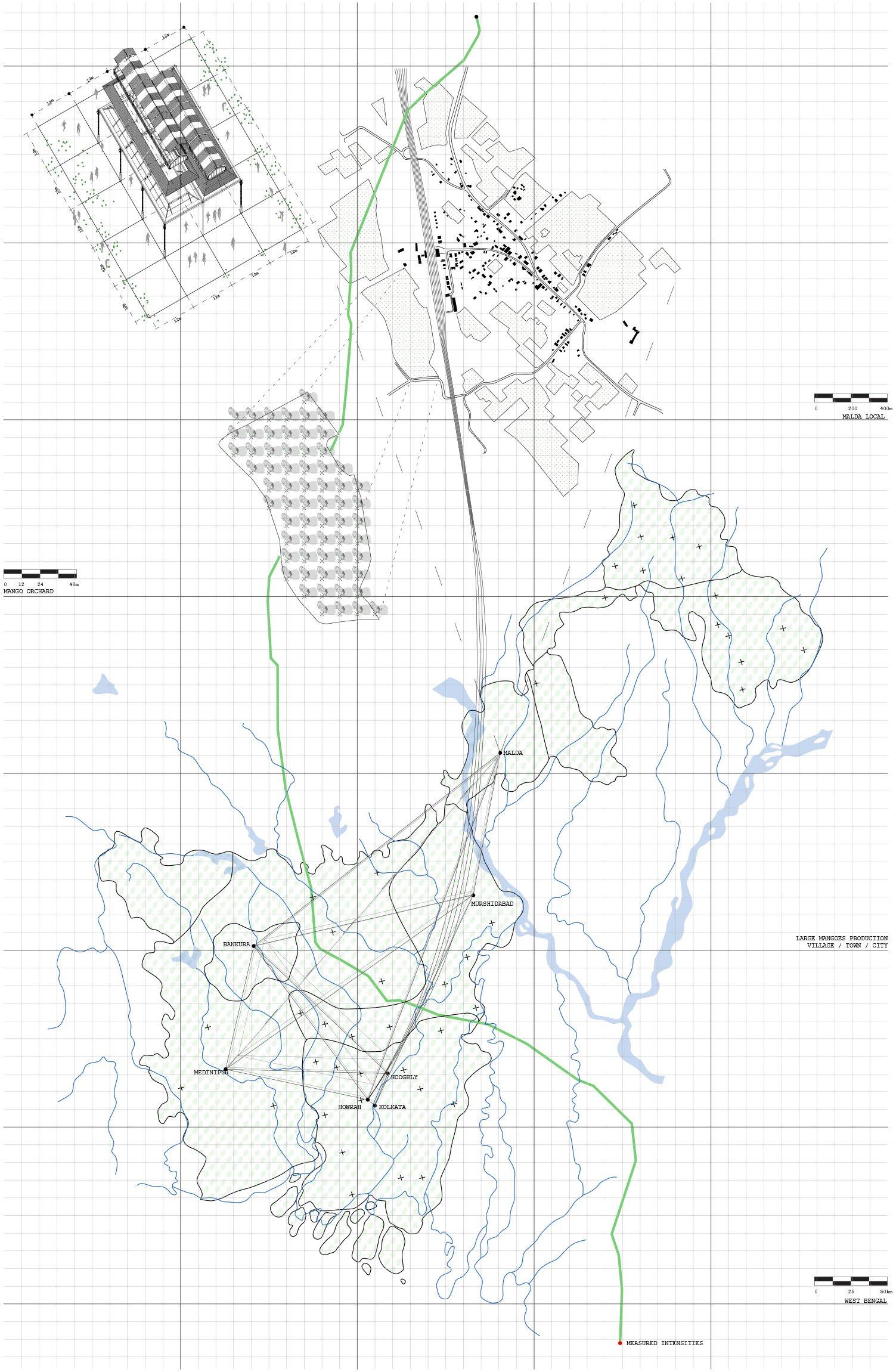 Our project navigates paths through both the historical context and contemporary contexts of Kolkata. We create new images of the city and its broader landscape. We operate in detail and in overview. We deal with speci c locations and look to developing networks at the infrastructural scale. We operate in speci c situations and recalibrate given overviews to o er alternative views of the city. We use design impulses and design projects both to o er and intercede in reinterpretations of the city. Our Research-By-Design practices are “strategic design” practices.