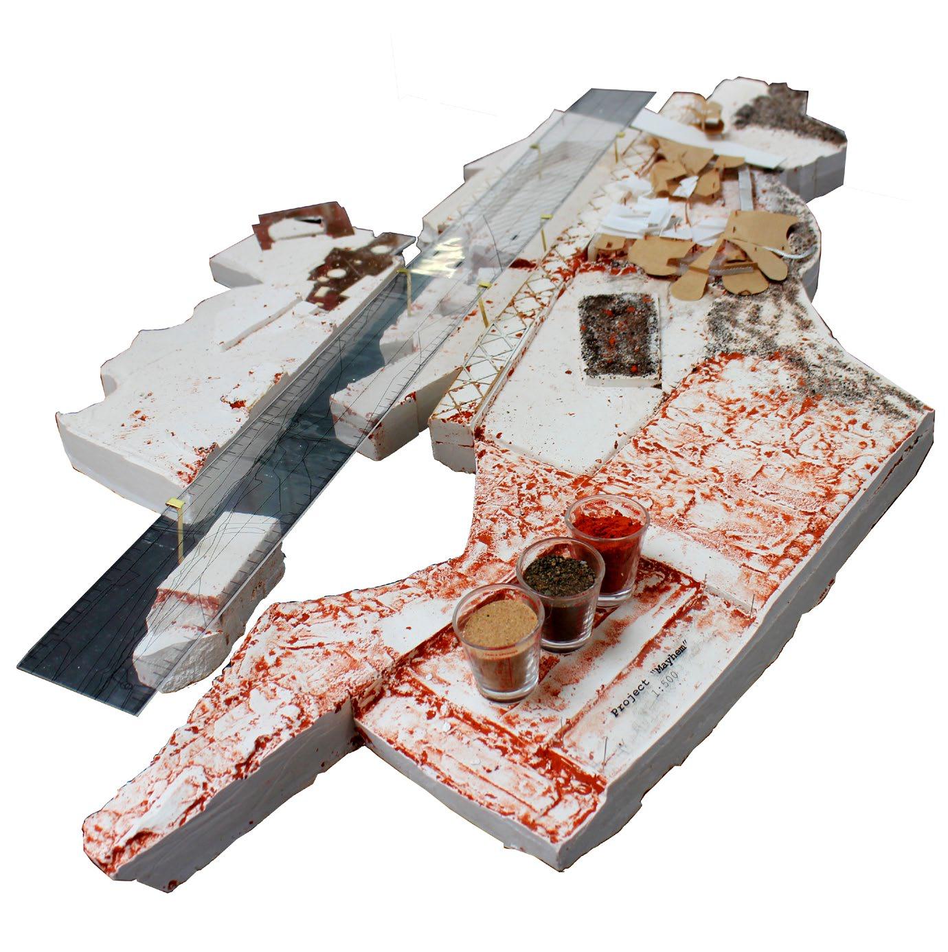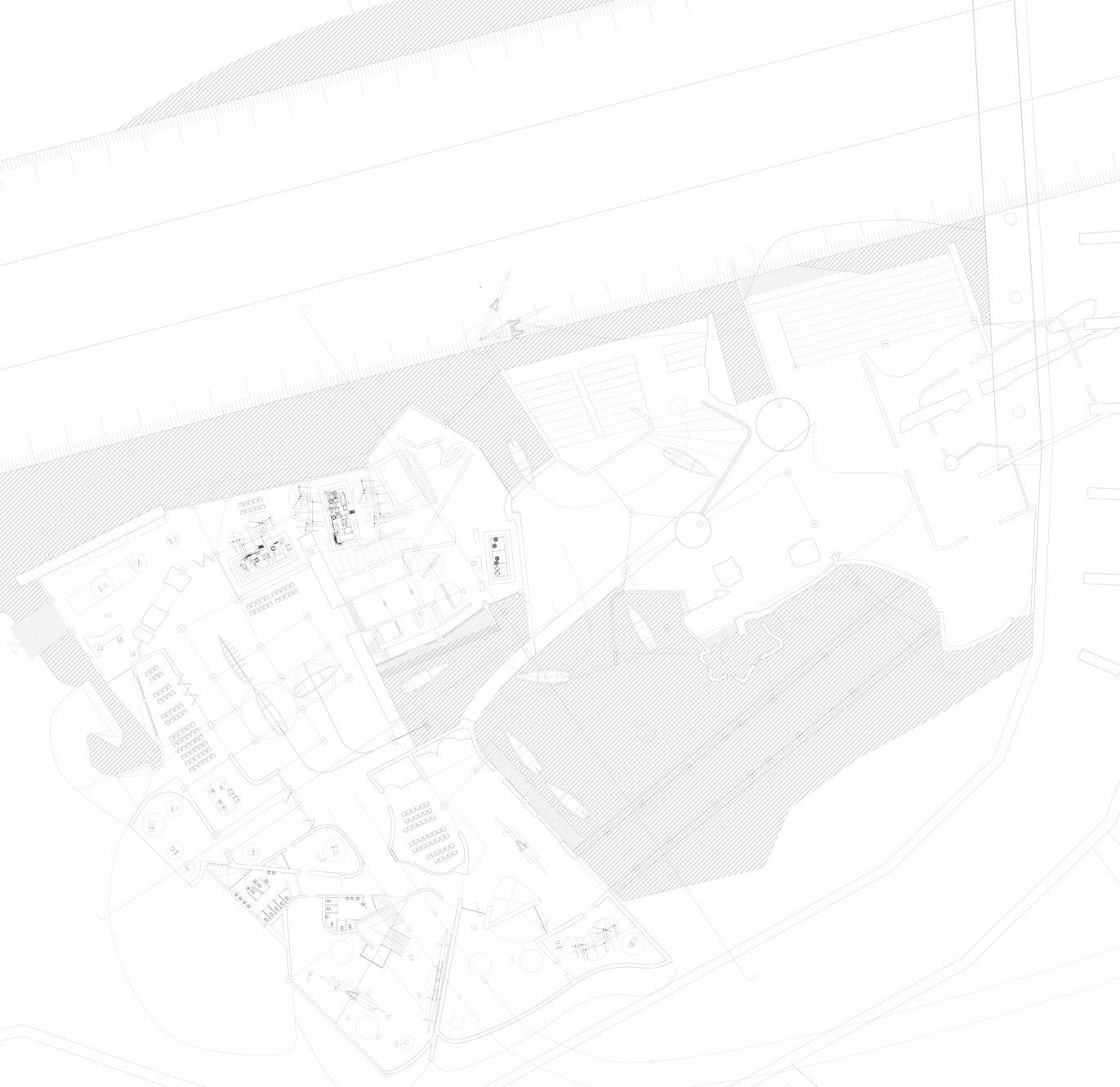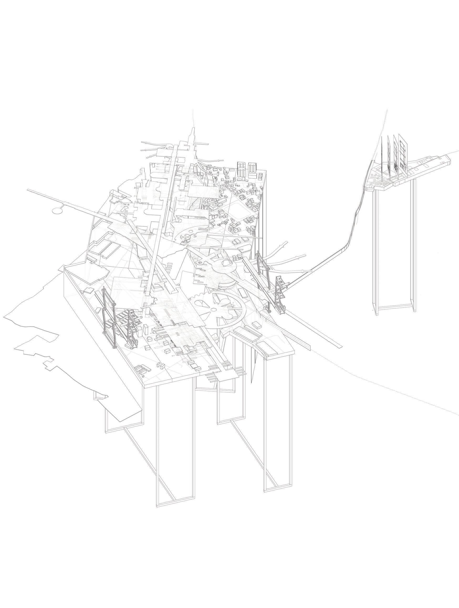 e project explores the geopolitical situation of the Kidderpore Dock territory in South Kolkata. A proposal for immersion of the existing boundary between the private and the public is o ered, where a recalibration of boundaries is directed by the ink-lineations of cultural exchange. e governmental authorities of the Kolkata Port and its rich history of being constructed by the British East India Company have, over time, de ned a hard border. us, the project o ers architecture that softens the existing hard borders to re-territorialize former exclusivities as perforate series of public/private economic land and aquascapes.
