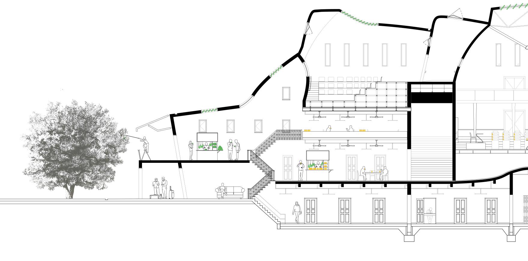 e project is a study of lingual liberties facilitated by the agencies of co ee and chai. e architecture rede nes, recon gures and reinterprets the con nement of co ee and the seclusion of chai and designs a tactical gap between the two commodities. e gap, the Lingual Library, a blur in the relationship between the two agencies, is stirred to provide spaces that negotiate the ground of discussion between them and beyond into the academic ground of College Street.