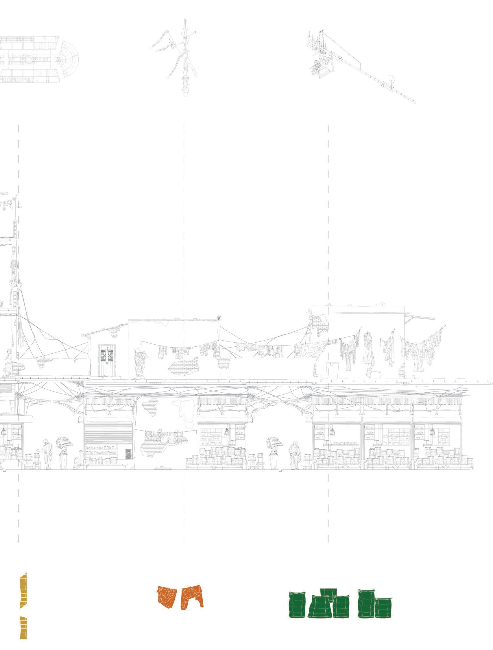 e measured intensities taken place in the Kidderpore market and 539 Rabindra Sarani in Kumortuli have revealed a character of Kolkata whereby residential dwelling spaces are closely knit with spaces of trade, production and distribution: the printing press factory adjacent to the Kumortuli apartment building and the busy Khidirpur market are immersed amongst vivid individual and shared residential spatial systems. e Kidderpore Docks are explored and recalibrated through the lineaments of Kidderpore and Kumortuli – places of particular social and urban character that immerse productivity into everyday life. Kidderpore and its architecture are redrawn as intensely inscribed surfaces that describe porosity rather than impermeability, taking their regulatory instructions from the various creative recalibrations of printing works, food packaging and other cultural distribution systems.
