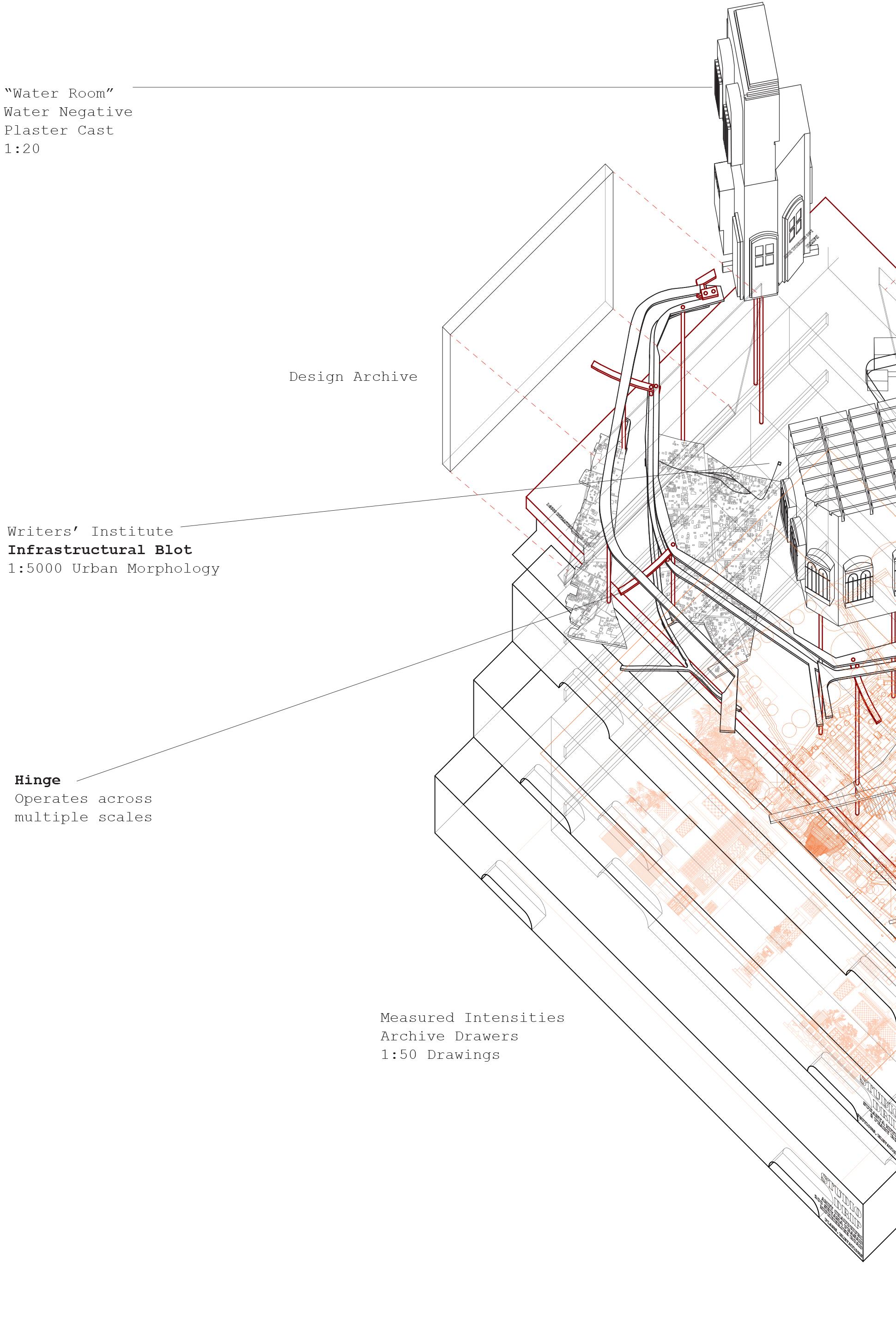 Body acts on Building, SET and TLML: Genealogical Origins are given Geometric Origins through contextual placement and apparatus follows line of pumping stations. 1:100 plans, 1:500 site plans and 1:20000 city plans are recalibrated using the 1:20 apparatus. Thresholds are displaced to widen streets, locating blotting zones at TLML scale.