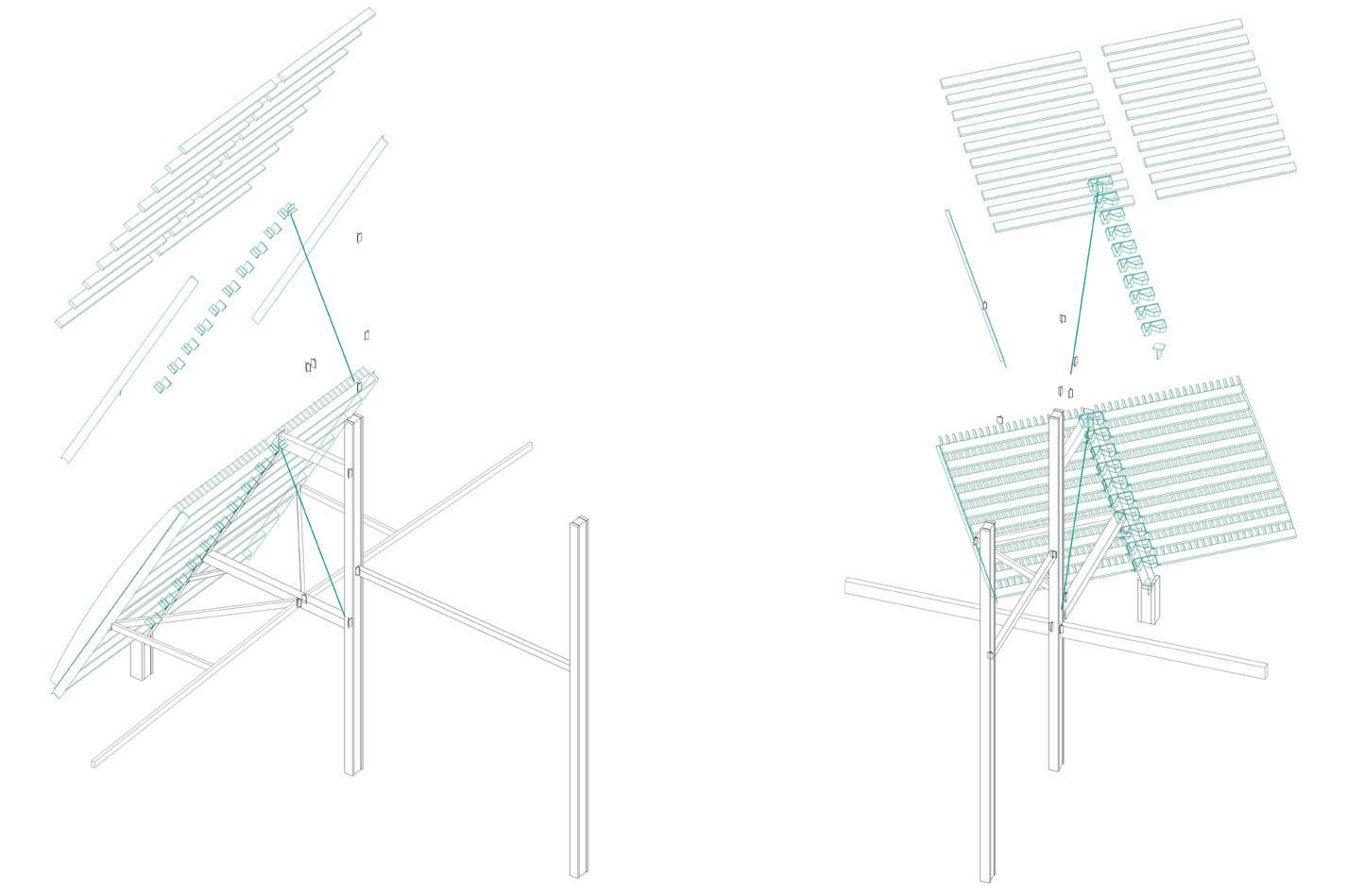 e three buildings form the Calcutta Institute of Aviculture; they share a tectonic language but develop species speci c programmatic and architectural mutations. eir open envelopes provide shade, rain cover and air movement, creating outside buildings which hold moments of environmental control, all drawn in di erent ways from the wetness below and all around.