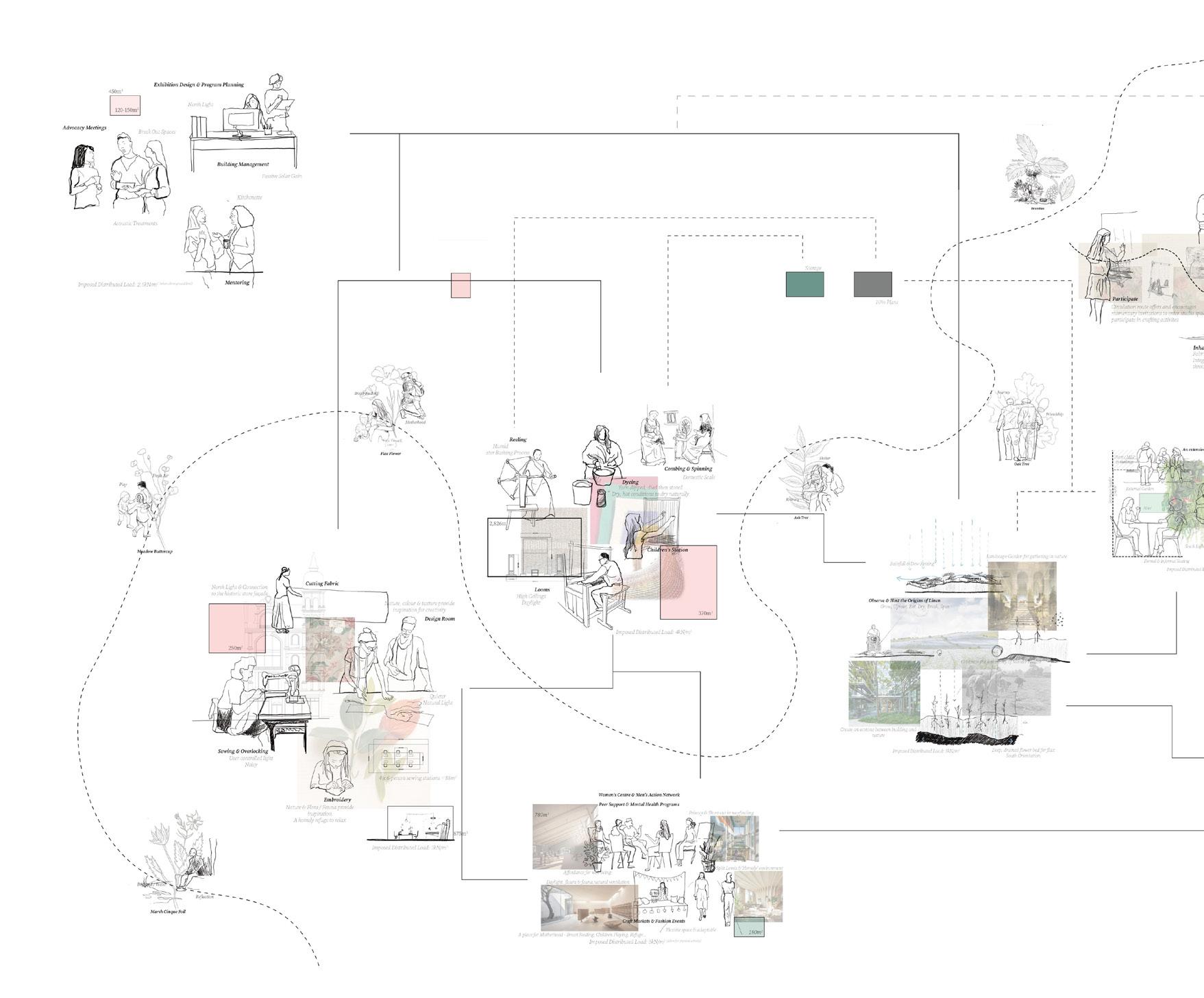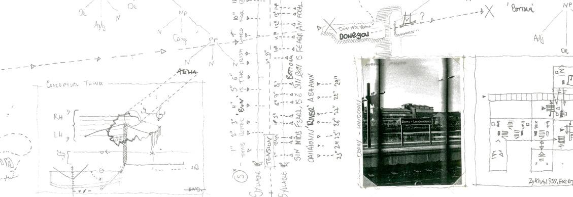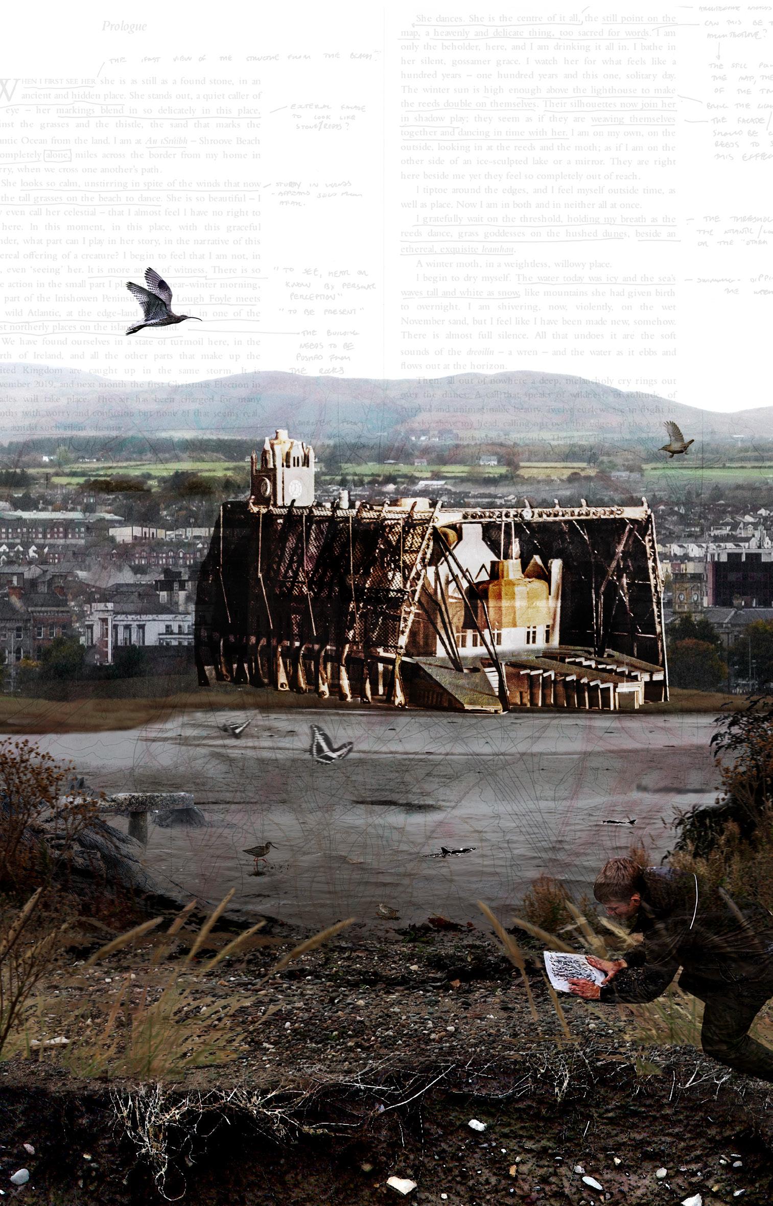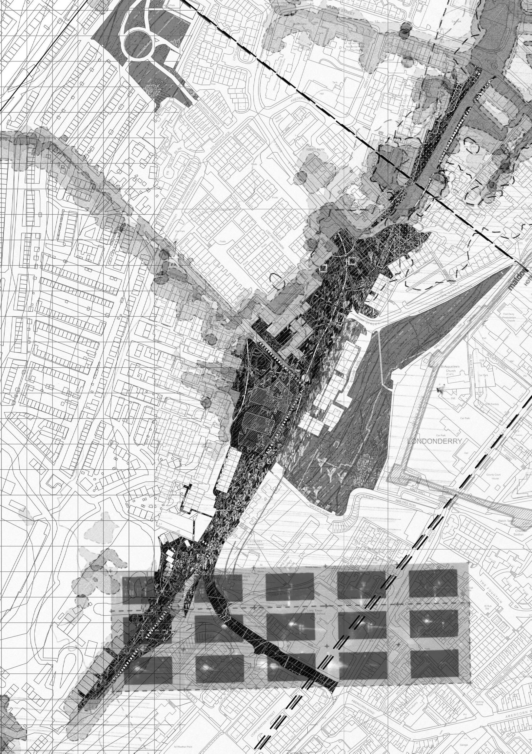 define the urban behaviours of the city; Repairing the the inter-species, ecological communities damaged in the post-Anthropocene, through an understanding of the effects of non-native, human interventions and using creative concepts and locations inspired by Kerri Ni Dochartaigh’s book, ‘Thin Places’; Re-establishing and recalibrating a new urban, feminine ‘in-between’, once an established phenomenon in the city of Derry during its flagship days as a centre of female dominated craft process and linen production; Proposing the transformation and repair of the relationship between the city and its River Foyle to a place of ecological richness, human agency and well-being. A relationship broken by industrialisation and technological change in the 19th and 20th centuries; Imagining an architecture of renewal from the ashes of the Bogside Bonfire as a place for reflection, re-growth and re-use as part of a regenerated wetland, recalling the historic wet landscape of Derry’s bog; Translating and re-appropriating existing colonial typologies and motifs through concepts of irrational rhythm, indigenous structure and vernacular spatial sequencing inspired from Irish myths and literature; Traversing both the tangible and intangible edges of the ‘in-between’ of the Bogside and the old city walls to regenerate historic green and blue connectivity within a newly enriched ecotone, which forms part of an aquatic landscape of human well-being.