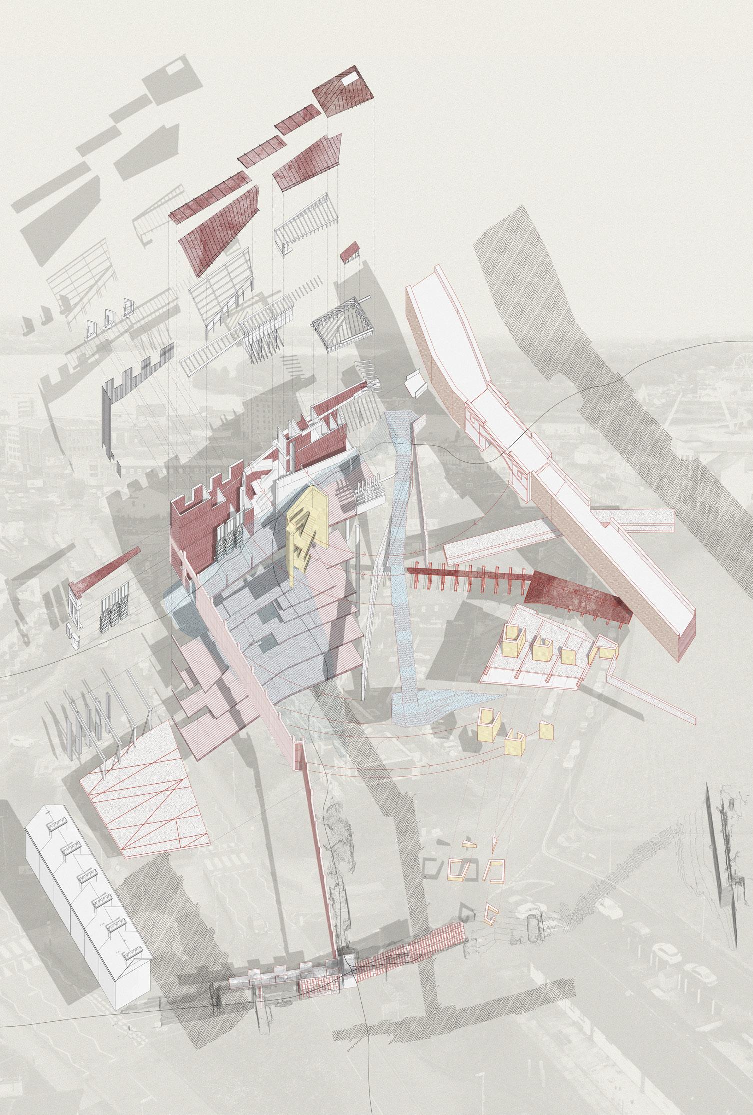 An experimental edge structure prototypes these themes and is the precursor to a broader urban intervention which responds to histories of displacement, exploitation and importation of architectural material with empathy and resourcefulness. At the edge of the Bogside, the notorious Meenan square site and the stretch of Lecky Road underneath the flyover are reclaimed, serving as the testing ground for new ways of building with material from derelict sites across Derry. A core is formed from the very material which holds centuries of architectural history and provides the tools for the design and construction of any number of further experimental structures across the community. Construction skills are shared, and new ideas are tested which show greater empathy to the people, and material, which comprise these communities. An architecture of touch provides two affordances for communities within Derry; a sense of intimacy with one’s surroundings, and the agency to work with and improve them.