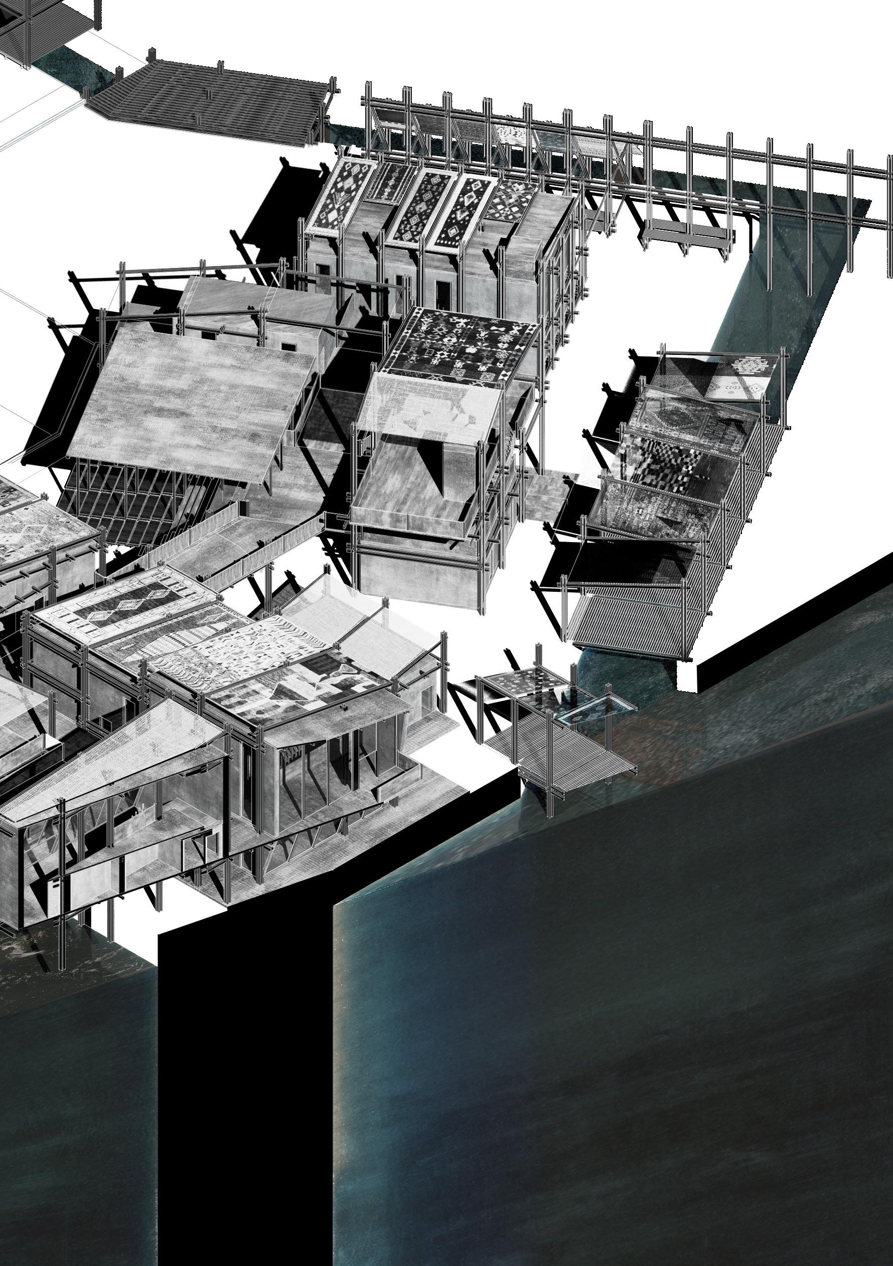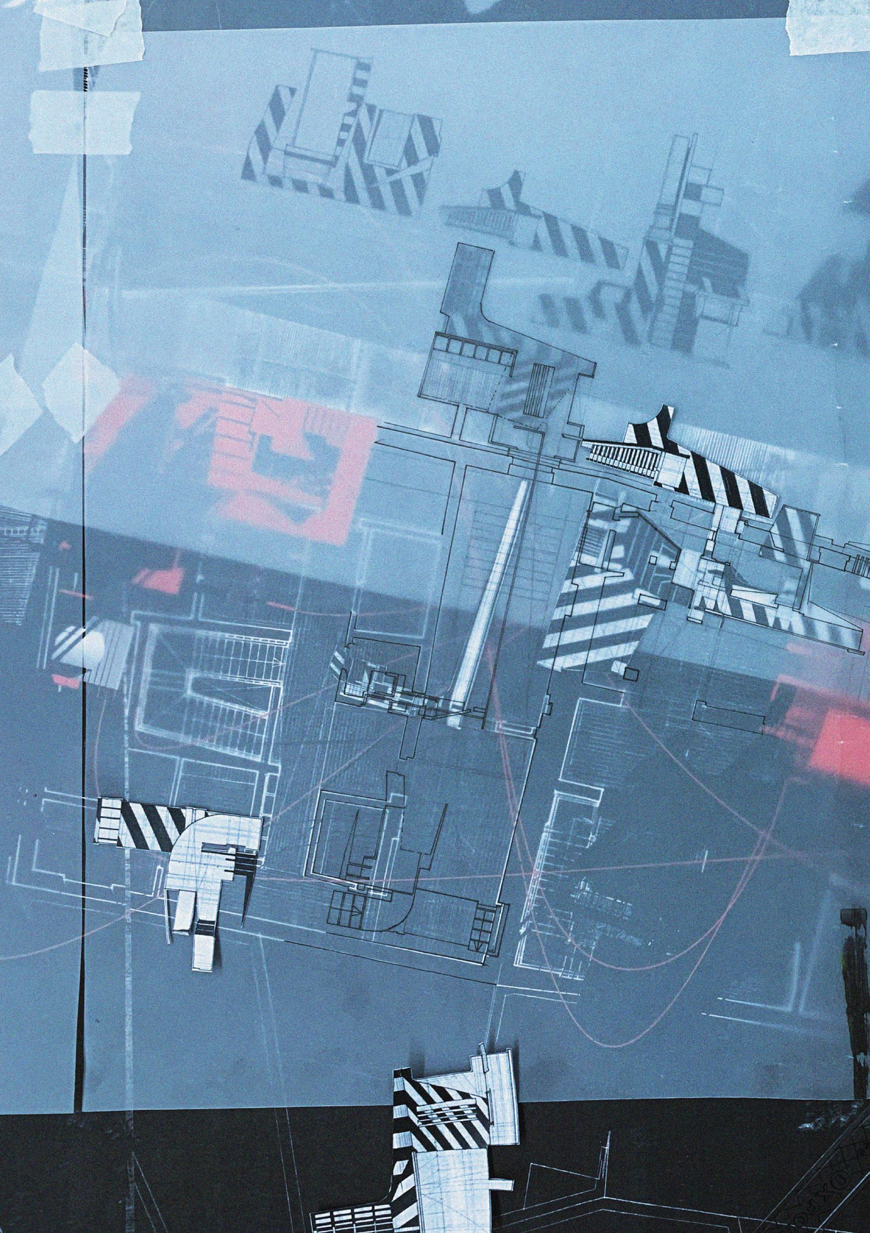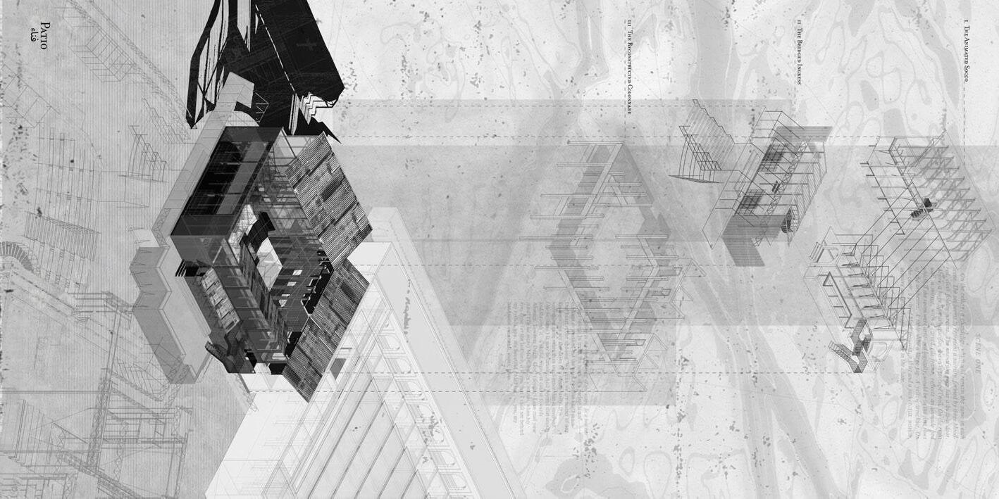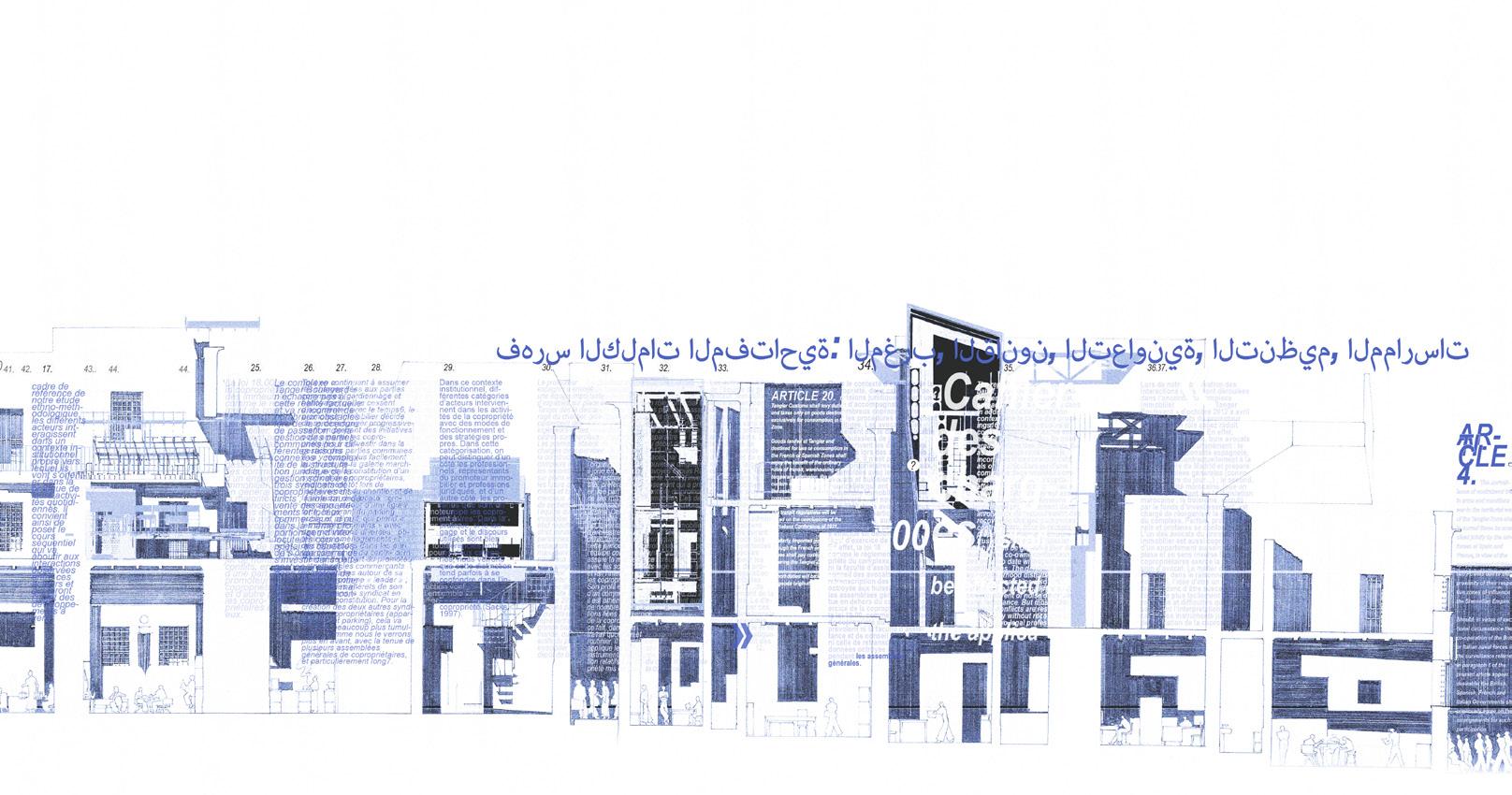 A manipulated legal framework provides an opportunity to reclaim territory in a move against the zeitgeist. This series of chance operations becomes a form of cut-ups that projects back onto itself simultaneously. Opportunistic architectural interventions cloak themselves in the historic narratives present in the Petit Socco, addressing various issues ; corruption is tackled through a digital stock market, censorship is combatted within a free-press publishing house, pollution monitored from a hydrological laboratory, and surveillance obviated through a telecommunications hub.Host and guest switch roles with increasing acceleration, the parasitic visitor corrupting the former only then to be corrupted themselves. Hidden in plain sight, the architectures play with their histories, revealing and concealing certain aspects via a series of exposed seams. Collectively, they form the Interzone.