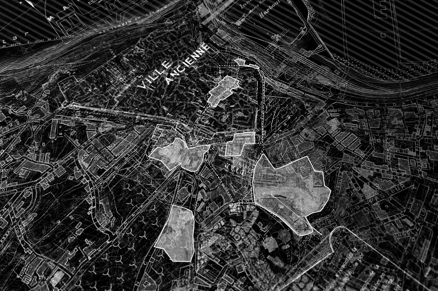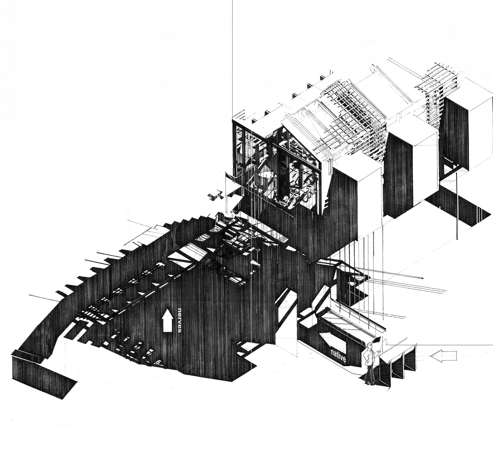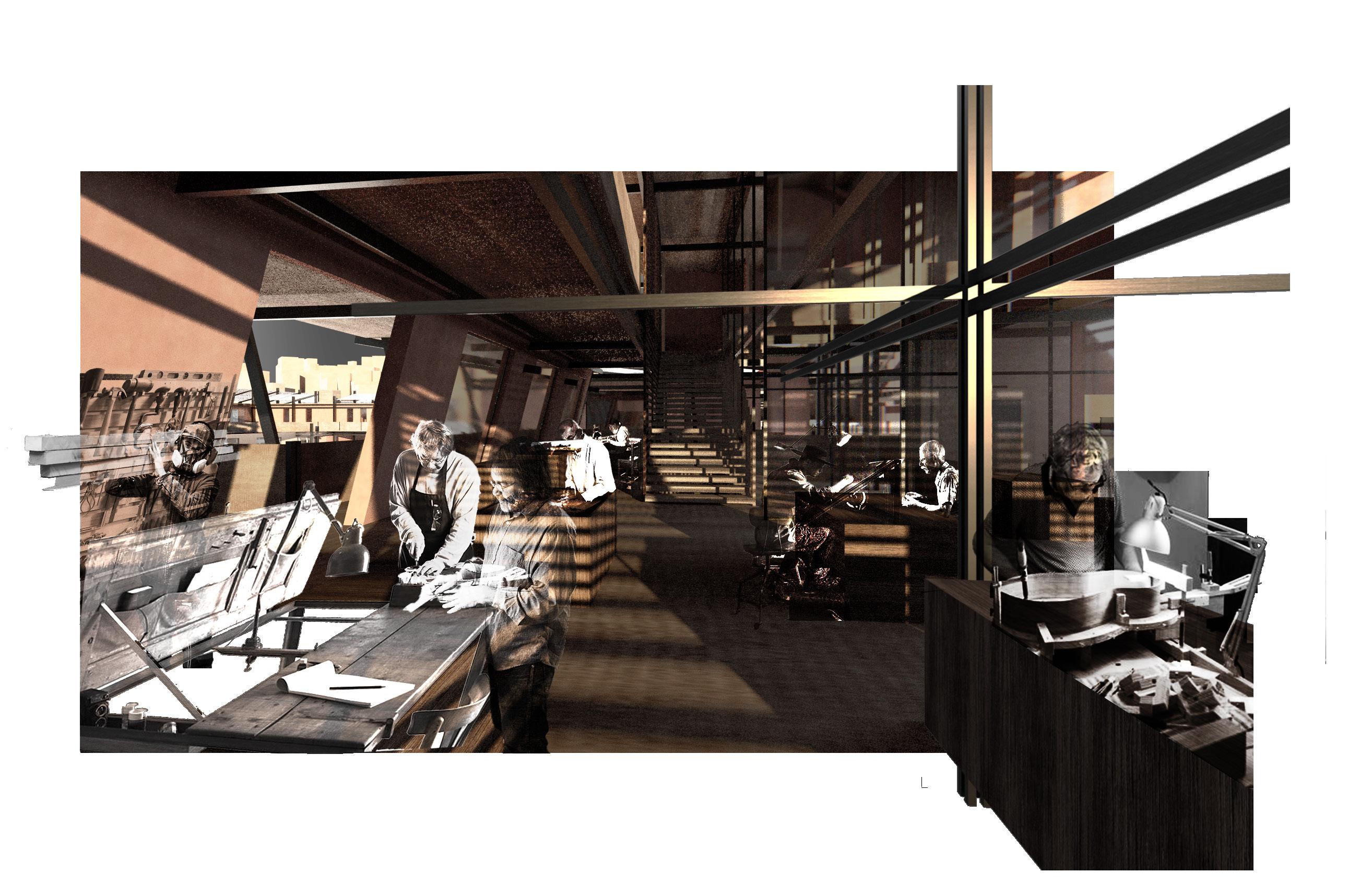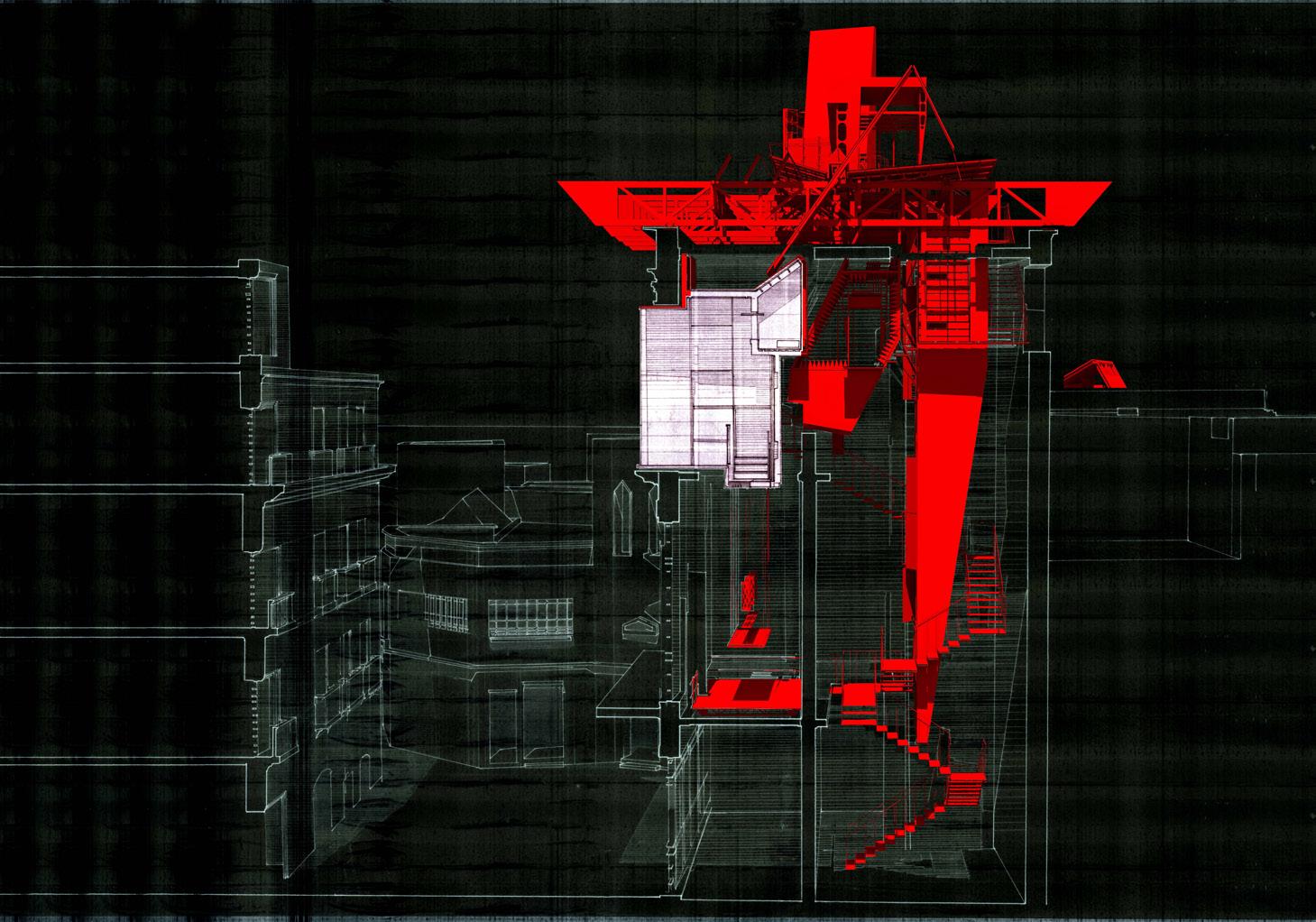 A manipulated legal framework provides an opportunity to reclaim territory in a move against the zeitgeist. This series of chance operations becomes a form of cut-ups that projects back onto itself simultaneously. Opportunistic architectural interventions cloak themselves in the historic narratives present in the Petit Socco, addressing various issues ; corruption is tackled through a digital stock market, censorship is combatted within a free-press publishing house, pollution monitored from a hydrological laboratory, and surveillance obviated through a telecommunications hub.Host and guest switch roles with increasing acceleration, the parasitic visitor corrupting the former only then to be corrupted themselves. Hidden in plain sight, the architectures play with their histories, revealing and concealing certain aspects via a series of exposed seams. Collectively, they form the Interzone.