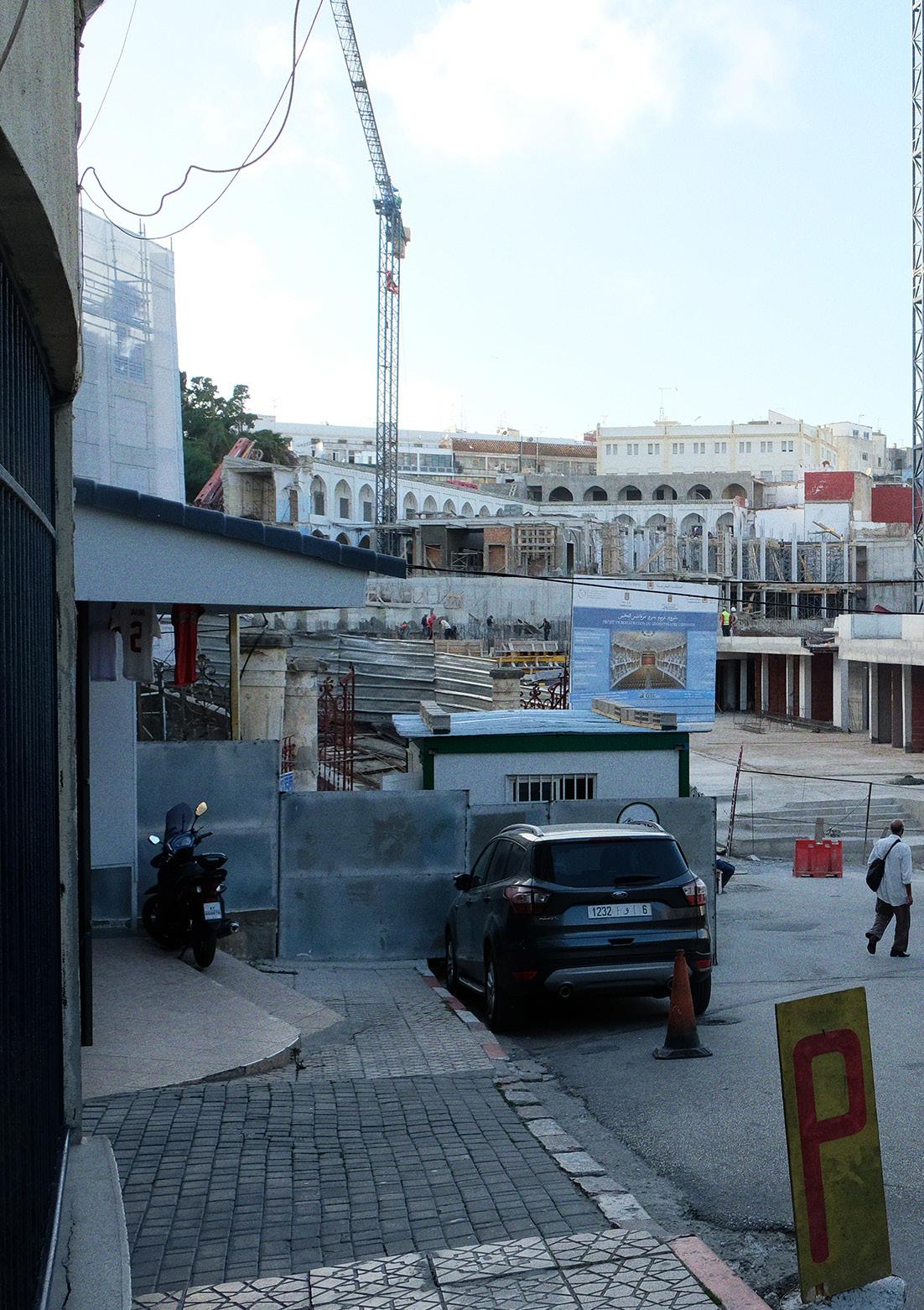 A number of state-driven neoliberal infrastructures have re-configured Tangier’s post-colonial condition since late-2000s. Tangier Med (2010), a main global shipping hub, currently ranks as the first port in the Mediterranean. It supports a range of industrial platforms distributed across the periphery of the city: Tangier Automotive City – and the adjacent Chrafate New Town, seemingly unfinished – Renault Tangier Med, Tangier Free Zone, City Mohammed VI Tangier-Tech under construction and the planned Free Zone Meloussa 1. The Tanja Marina Bay (2017) – the new high-end waterfront with a new cruise terminal, marina and retail – has disfigured the old city port to boost tourism. The international airport and the new high-speed rail service operating between Tangier and Casablanca support further a string of business centres, luxury residential complexes, golf courses and resorts spread along the bay.12 The program Tangier Metropolis (2013-2017) attempted a more integrated regional development through the improvement of roads and parking infrastructures, schools, day care and community centres, markets, mosques, a city of sports, as well as the recently completed Mohammed VI University Hospital. All these mega-projects have transformed Tangier from in a station in transit into a destination proper. The demographic impetus brought about by the scale of such investments has been met haphazardly by a swelling urban fabric that devours the surrounding agricultural land and threatens the beauty of this enclave. Furthermore, the top-down and exclusive quality of these developments sustain urban segregation, social inequality, and cultural homogenization. Meanwhile, some alternative, non-profit initiatives challenge the effacement of local culture, such as the Cinematheque de Tangier (2006) – an institution and archive for North African film culture – and the Mothership (2022) – a resource and research centre for local ecosystems – both supported by artist Yto Barrada.13
