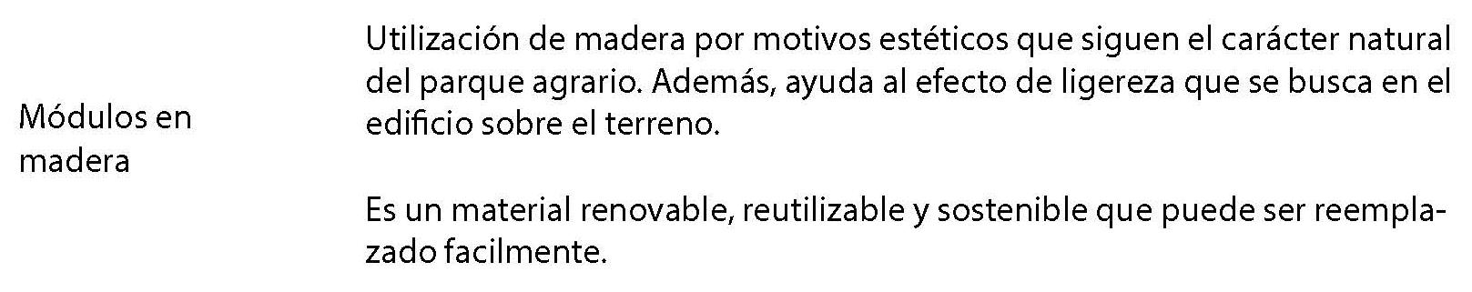 En algunos momentos la relación que se busca con el entorno del parque agrario es visual, mientras que en otros se busca una conexión directa que da salida desde los espacios hacia los cultivos.
