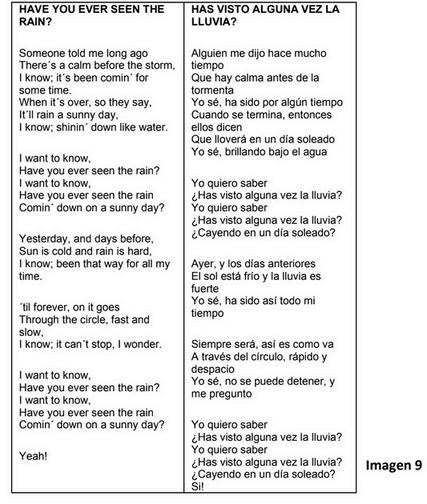 Despuésdebrindaropciones,debatir con mi grupo de estudiantes y reconocersuinterésporlamúsicaen general y la música en inglés se define la inclusión de una canción comorecursoparalaenseñanzadela lengua extranjera inglés. Este es el punto inicial para plantear una canciónconocidaporlamayoríade losestudiantesquienesproponenla canción de Creedence Clearwater Revival “Have you ever seen the rain?“(1971).