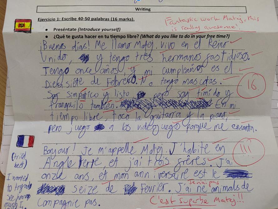 Our special mention goes to Matej (7ASI), who completed the writing part of his Spanish exam in both Spanish and French! Bon travail, Matej!